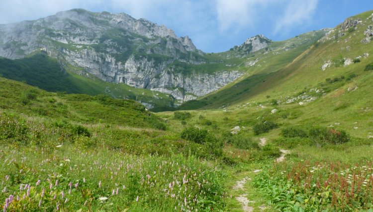 Il sentiero poggia a destra e sale sulla sinistra orografica della conca, verso una parete di roccia chiara. Prima di raggiungerla poggia a destra e si alza con una ripida diagonale a un terrazzo panoramico