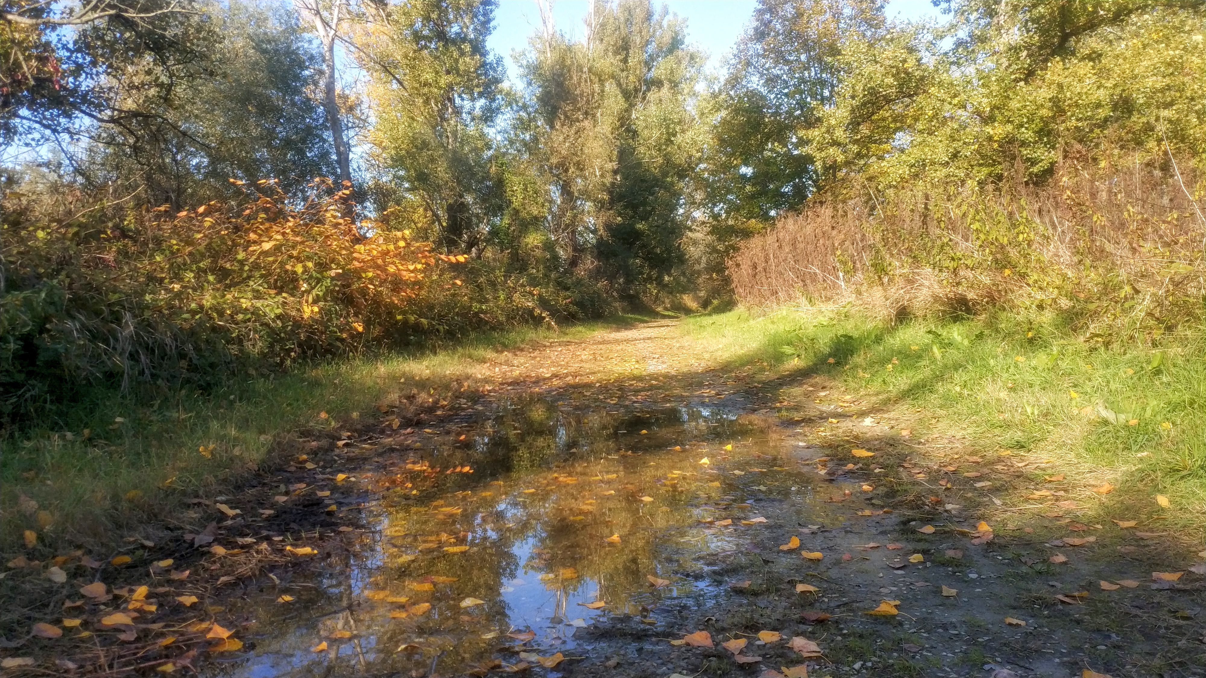 Fatti i primi 300 metri su strada dal consistente fondo ghiaioso, ombreggiata da alti esemplari di pioppo bianco, la si tralascia scendendo lievemente a destra per oltrepassare il piccolo corso d'acqua del Grue