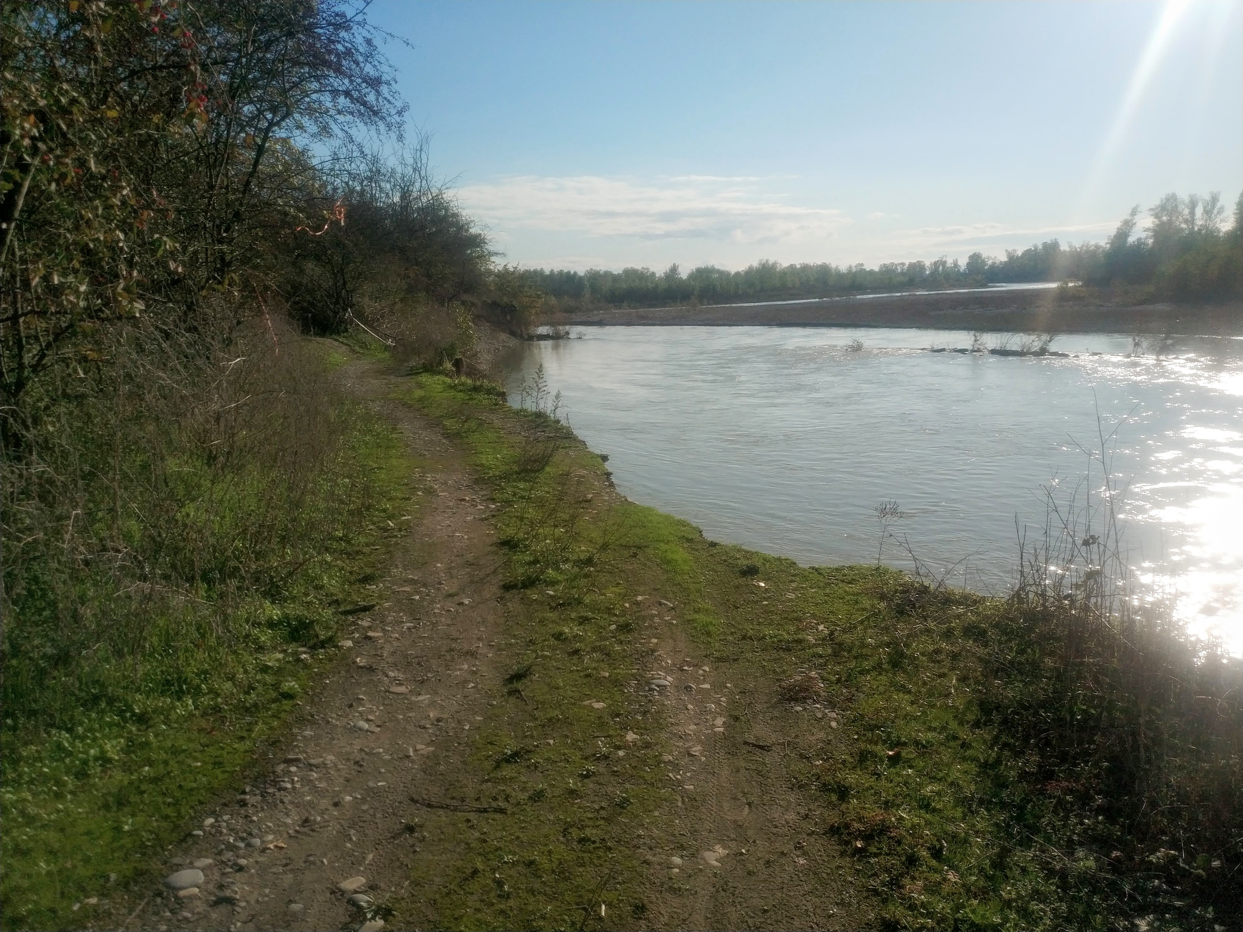 Si riprende il passo, che suona sulla ghiaia del fondo strada, seguendo la via che scorre diritta (dunque si trascurino le strade che vanno a sinistra rientranti verso il paese) e che un po' si allontana dalla ripa del fiume e passa tra macchie di bosco ripariale e ampie zone di gerbido, le praterie aride che sono l'habitat ideale delle orchidee, che qui si possono osservare nella stagione di fioritura. Nell'attuale stagione sono invece colorate dai rossi frutti della rosa canina, che intreccia i suoi spinosi rami disegnando intricati bersò.