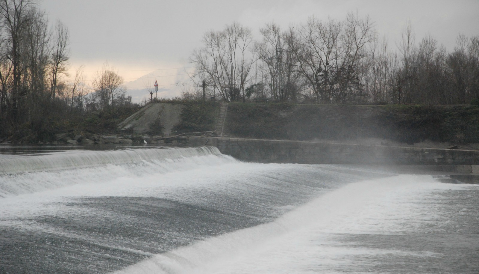 Scendendo a bordo fiume, in questo punto l'immagine della distesa d'acqua è particolarmente ampia e ferma, rallentata dallo sbarramento di una centrale idroelettrica di piccola taglia realizzata di recente a valle del ponte ferroviario che è ben visibile alla destra dell'osservatore.