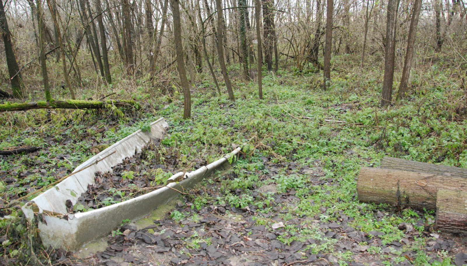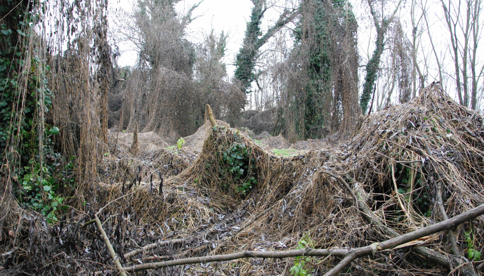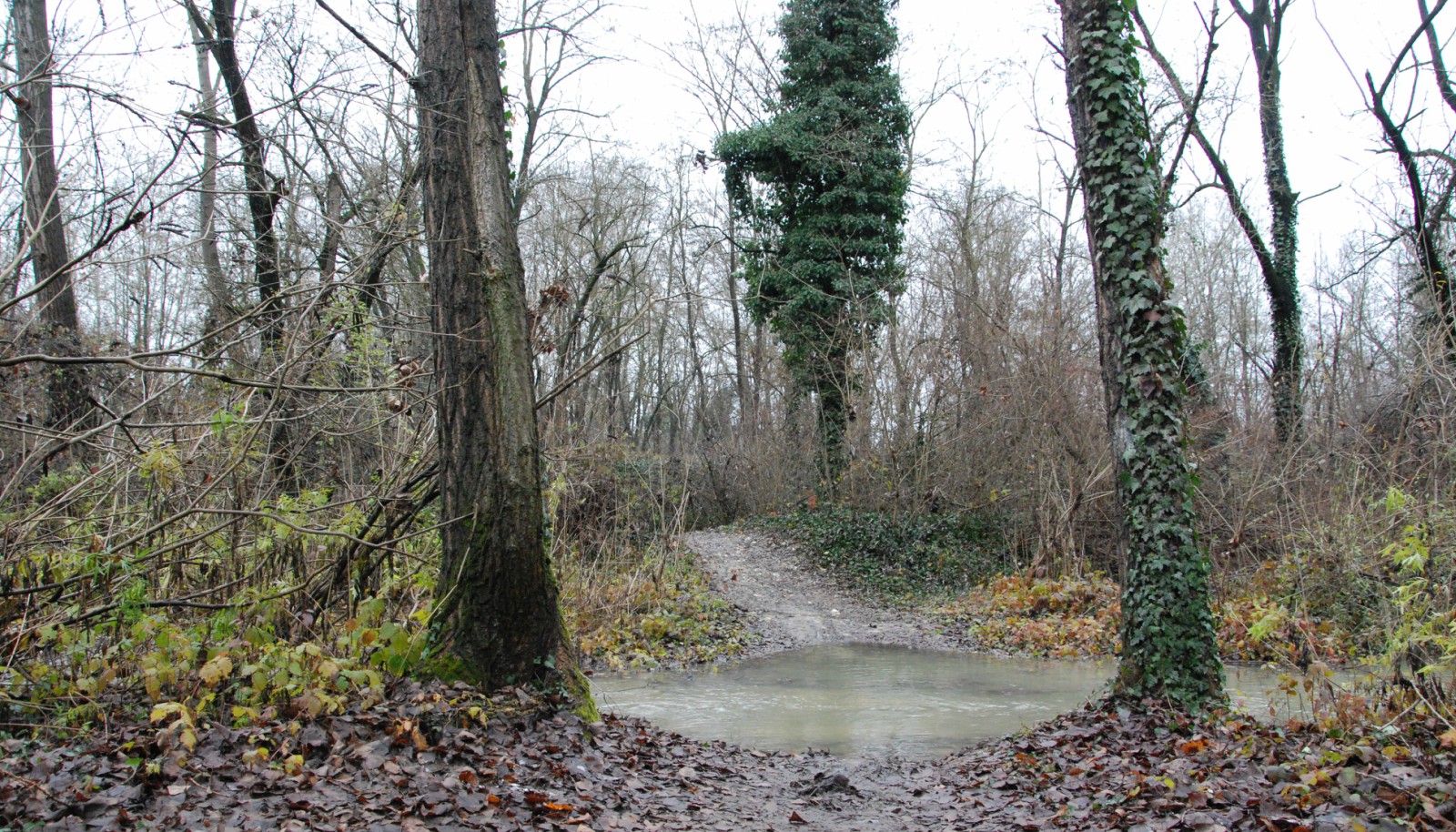 Il sentierino si addentra nella vegetazione, tra cui emergono alti esemplari di salice. Alberi e arbusti nel periodo invernale assumono un aspetto spettrale, quasi un paesaggio marziano, spettacolare e suggestivo quanto drammatico, dovuto in primis all'invasione del Sicyos angulatus, liana erbacea conosciuta anche con il nome di zucca matta, cucurbitacea di origine nord americana, dunque una specie aliena naturalizzata e divenuta molto invasiva.