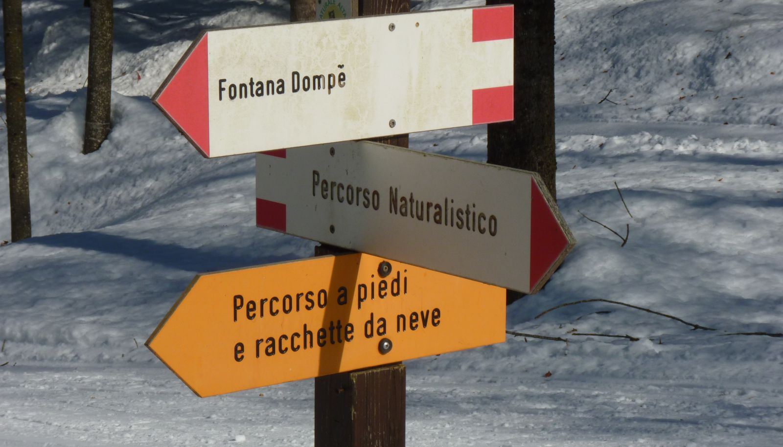 ), mentre altri cartelli invitano gli escursionisti a non camminare sulla pista di fondo, se non nei brevi tratti dove fondisti e camminatori condividono il tracciato. Ma la maggior parte degli escursionisti purtroppo non rispetta le indicazioni e cammina sulla pista, talvolta senza ciaspole, lasciando profonde impronte con gli scarponi, che rendono difficile e pericolosa la discesa dei fondisti. Quindi forniamo una descrizione dettagliata del percorso pedonale e degli incroci con le piste da fondo, per non sbagliare il tracciato e favorire una piacevole fruizione sia dei fondisti, sia dei camminatori.