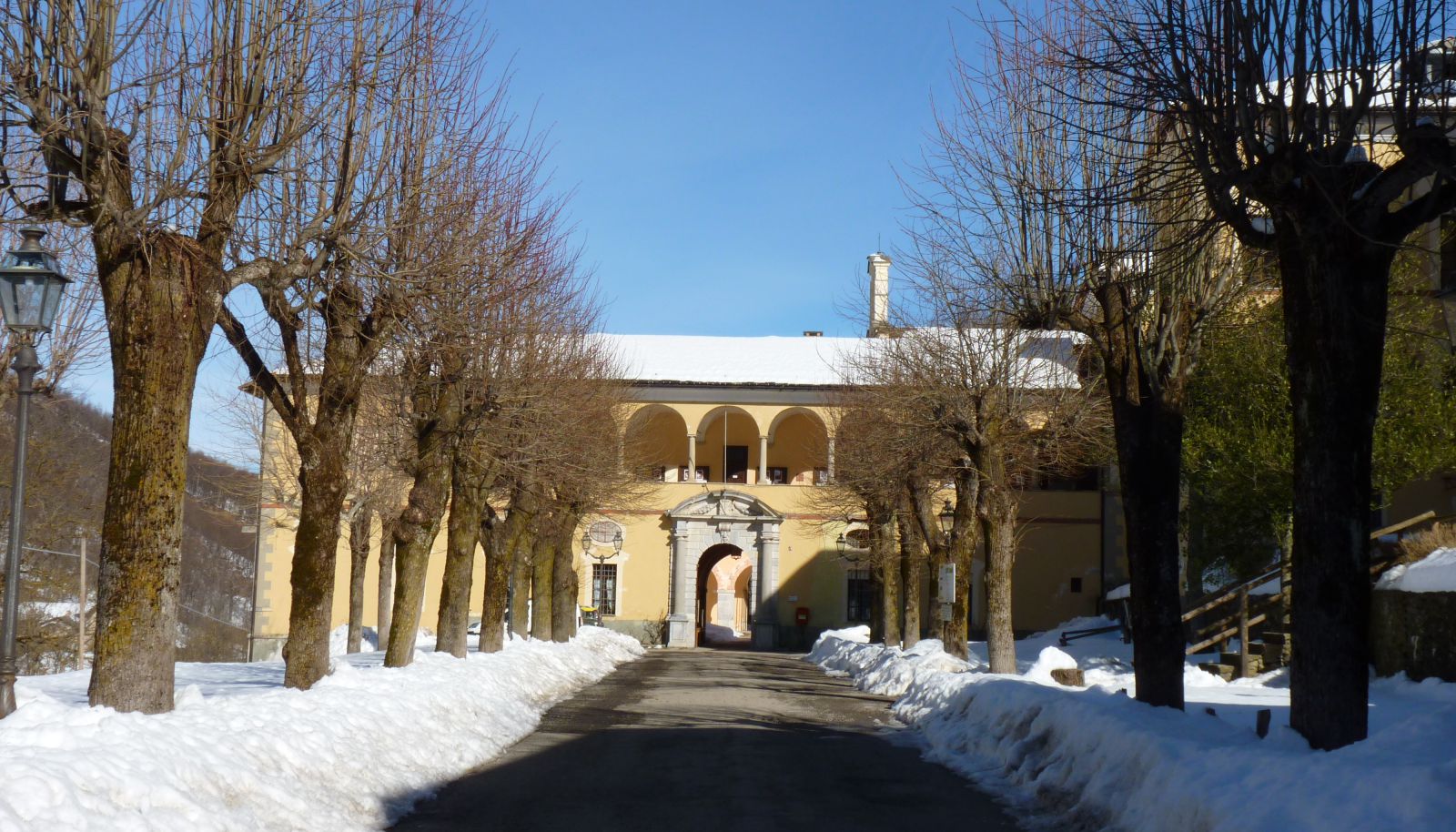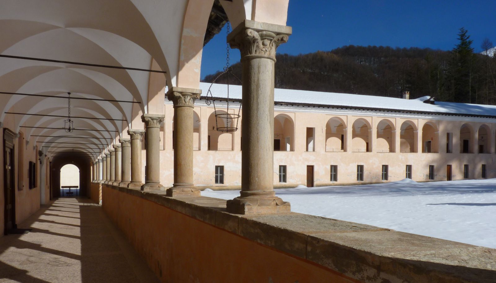 ) non lo chiudono da tutti i lati, per isolarlo dal mondo esterno, come in altre abbazie: verso est si apre sulla montagna, così il fitto bosco e il pendio innevato sembrano entrare nel chiostro, unendo i luminosi porticati alla natura circostante.