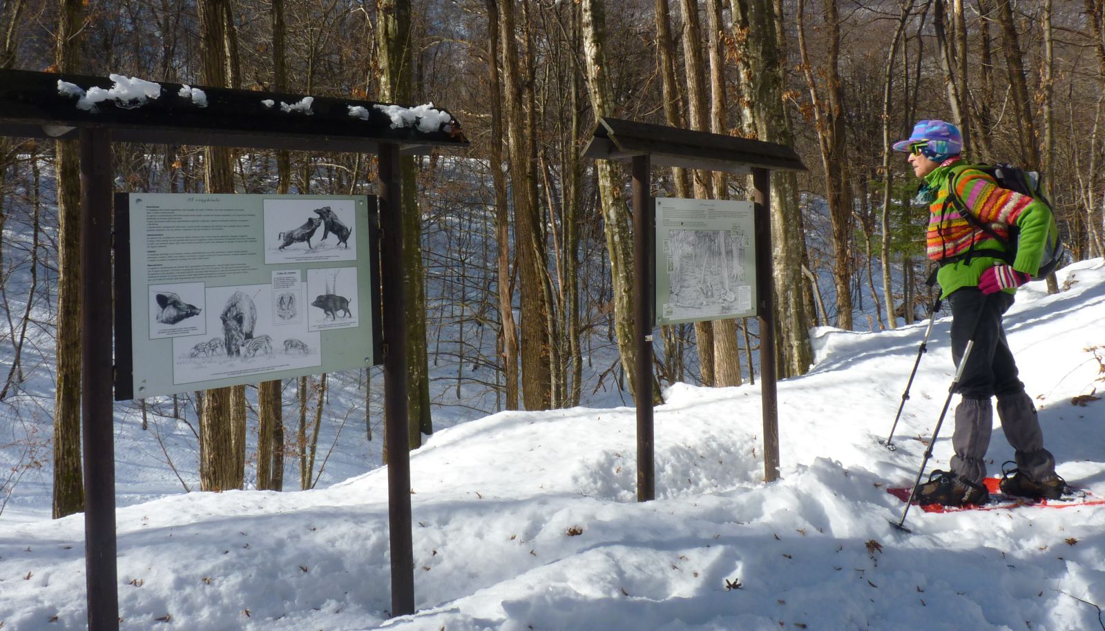 ), dedicati ai cinghiali, al bosco ceduo e al bosco di castagno. Il percorso naturalistico, indicato anche da segnavia bianco-rossi sui tronchi degli alberi, prosegue in lieve salita, incrocia una pista forestale (cartelli) e procede quasi in piano, parallelo alla pista di fondo tracciata poco più in basso. Nel fitto bosco si attraversano alcuni piccoli ruscelli e si incontra un'altra piazzola con pannelli del parco (lupo e latifoglie nobili). Si passa a monte di una radura dove transita la pista di fondo e in lieve discesa si raggiunge un tratto un po' stretto delimitato da una staccionata (