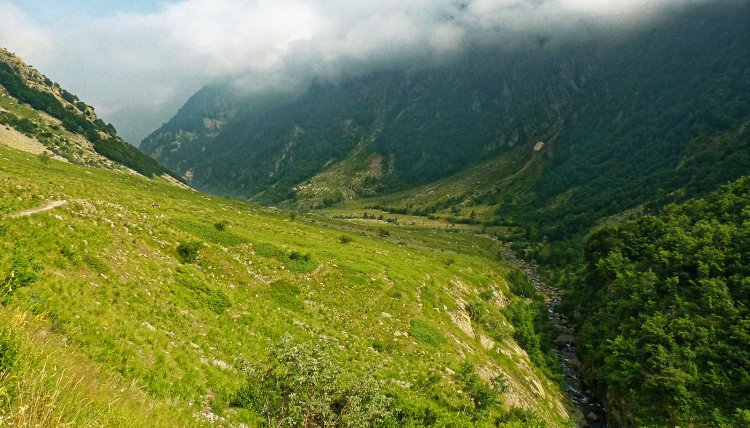 Ci si abbassa di poco nella conca, ricca di acqua (attenzione alle ortiche), poi la traccia si rialza sul versante opposto svoltando a destra. La mulattiera, di nuovo evidente, sale in diagonale, alternata a lunghi tornanti, con vista dall'alto sulla conca del Gias Gros e sul Vallone della Meris
