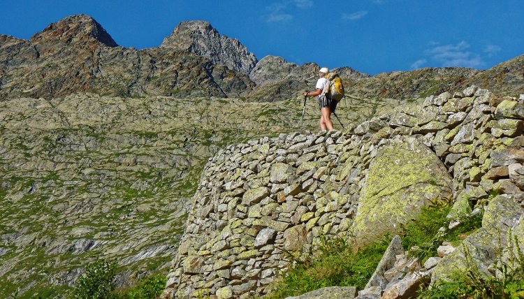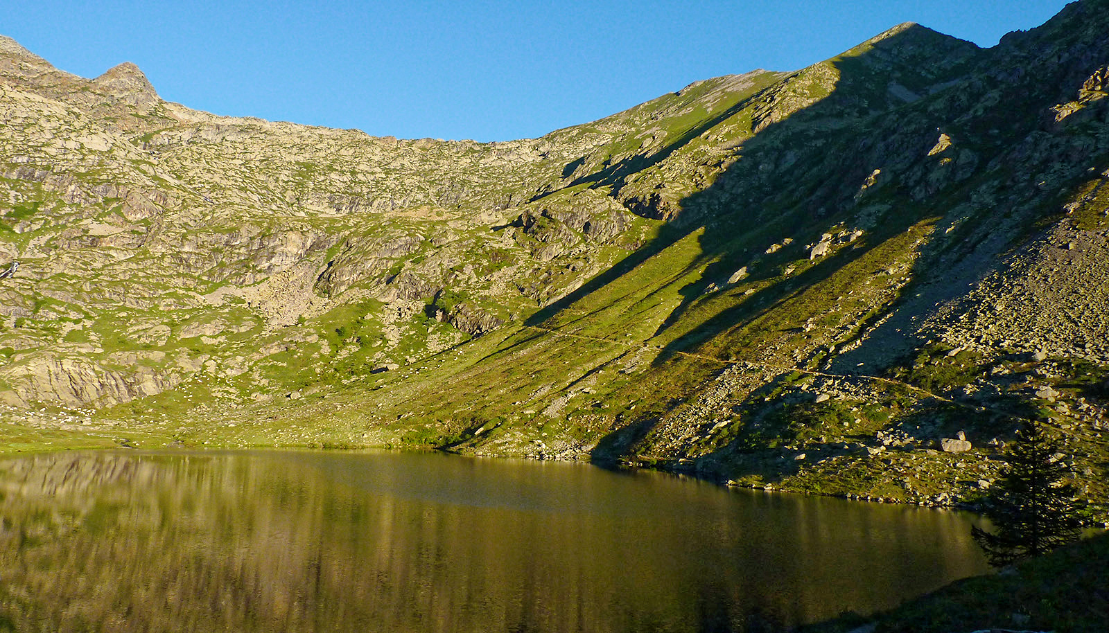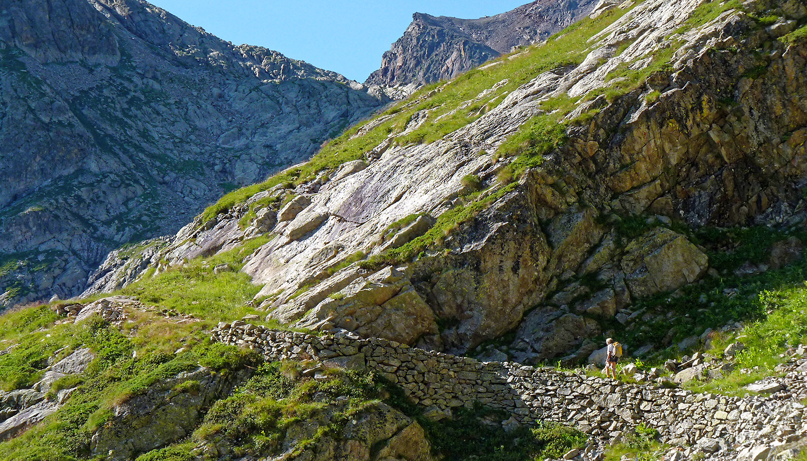 . Va in diagonale verso sinistra (sud), prima tra la pietraia, quindi tra le rocce montonate, arrivando al valloncello in cui scorre lo spumeggiante emissario del lago. La mulattiera si alza con molti tornanti costruiti su alti muri e dopo l'11° punta verso il torrente, presso il quale si trova un bivio (2308 m, 0.40 ore).