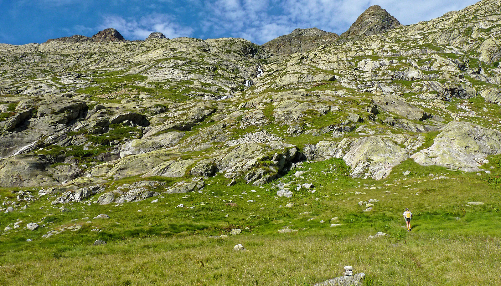 , delimitata da pietre infisse nell'erba. Infine la mulattiera fa pochi zig-zag alla testata del vallone, toccando un grosso ometto già visibile dal basso, da cui giunge subito al Colle della Valletta (2488 m, 0.35 ore).