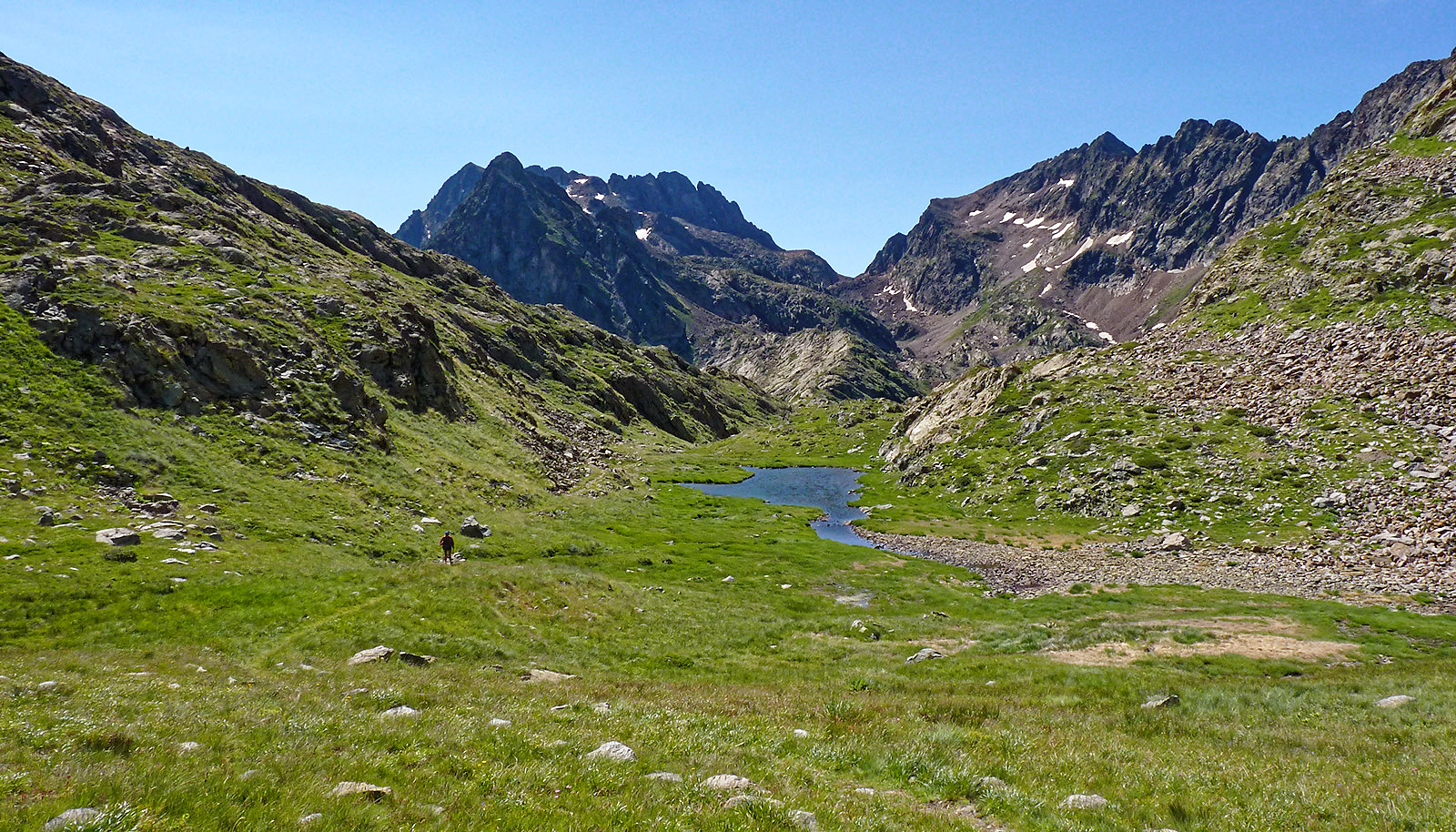 La mulattiera si allontana subito dal lago, entrando in un valloncello erboso all'inizio pianeggiante, dove attraversa con tratti in rilevato il rio e sale vicino ad esso in destra orografica, costeggiando un laghetto. Riattraversato il ruscello, costeggia un altro laghetto e sale nel valloncello