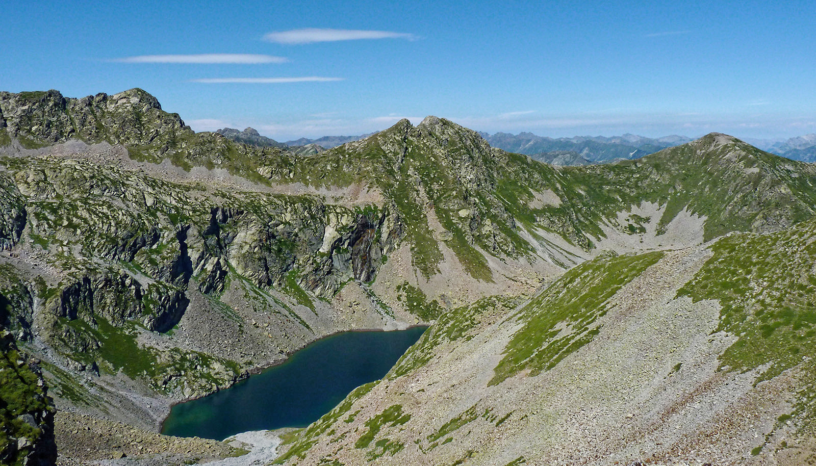 Dal panoramico valico si vede - 250 metri più in basso - il grande Lago Soprano della Valletta
