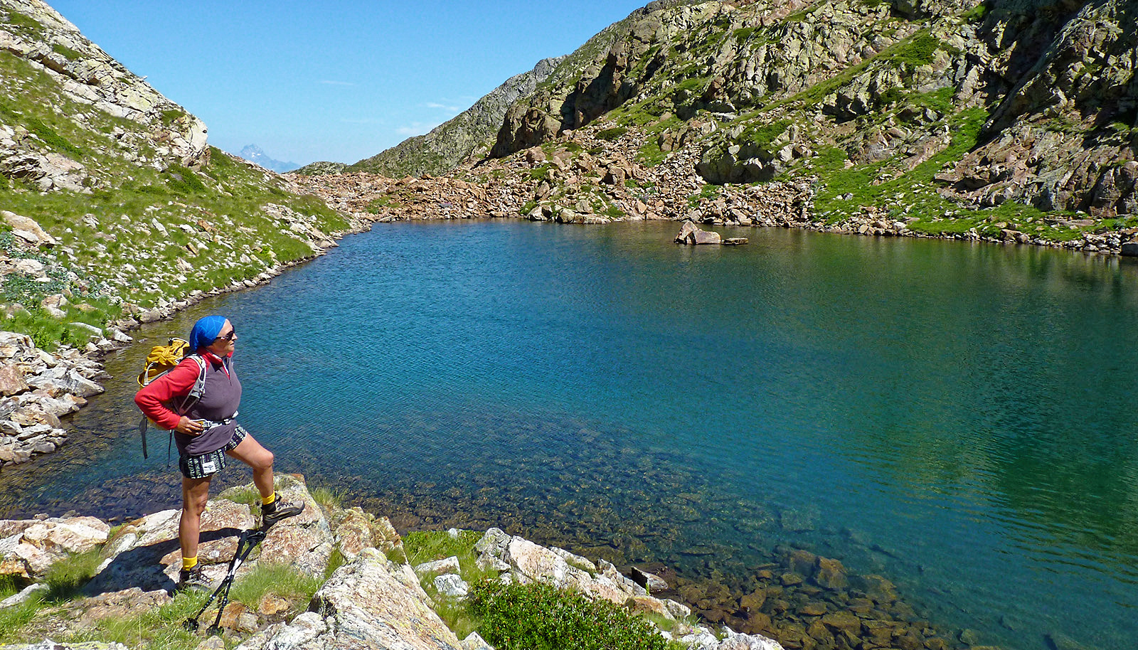La maggior parte degli escursionisti si ferma sul colle, ma conviene proseguire sulla mulattiera (P58) che va verso sud quasi in piano, dominando dall'alto il Lago della Valletta, e in lieve discesa giunge a un suggestivo laghetto (