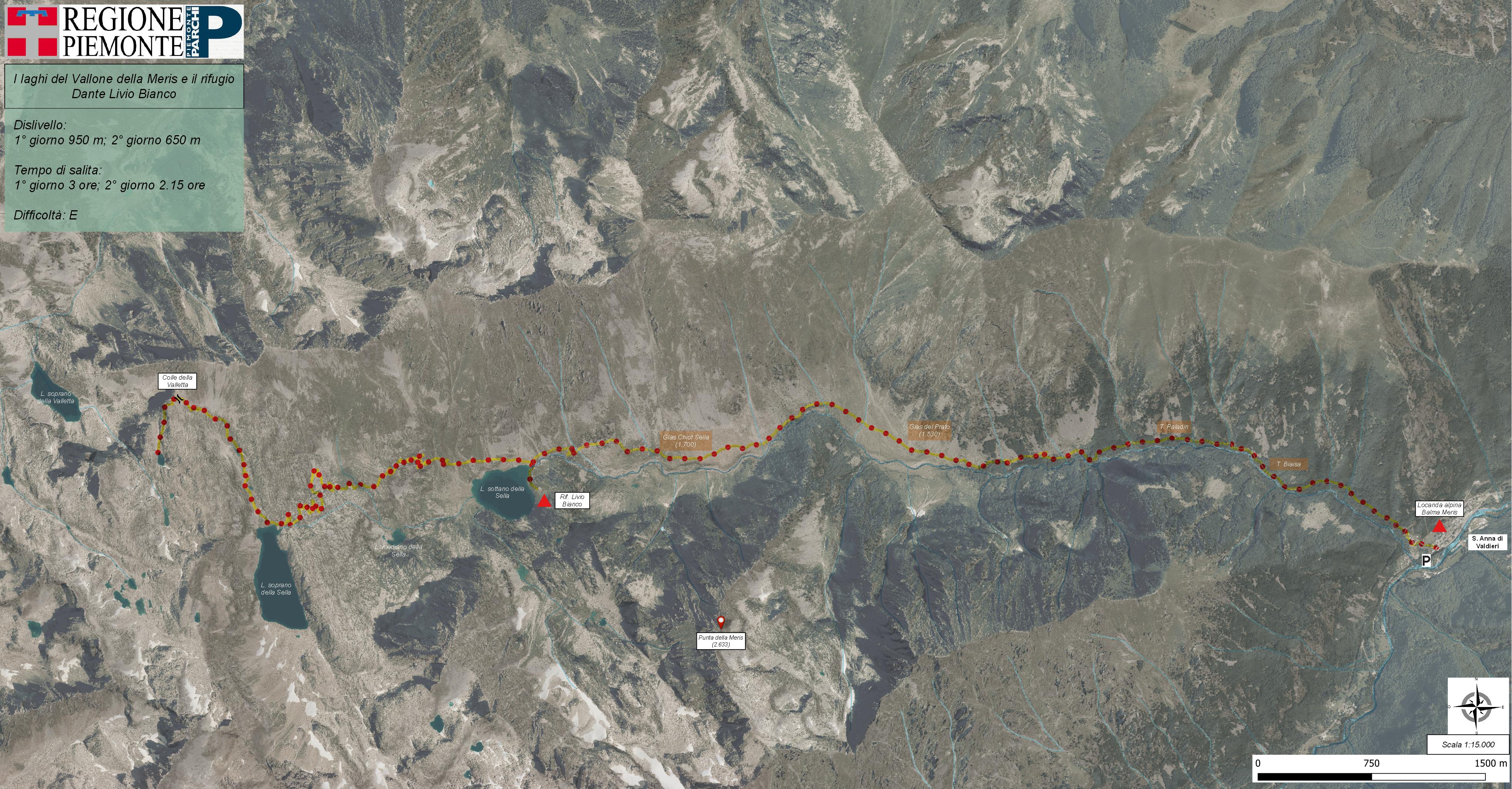 Si attraversa in lieve salita il vasto pascolo, lasciando a destra un piccolo edificio d'alpeggio più recente. Al termine della conca si aggira il costone orientale della Punta della Meris, oltre il quale il vallone piega a sinistra e la mulattiera riprende a salire dolcemente in mezza costa, di nuovo in vista del Rio Meris. Lasciata a sinistra la mulattiera per il Vallone del Bars, si esce in un vasto pascolo dove la mulattiera si allontana dal torrente, con un tratto inerbito (poco visibile con nebbia) in direzione delle ex Case reali del Chiot della Sella (1700 m, 0.40 ore).