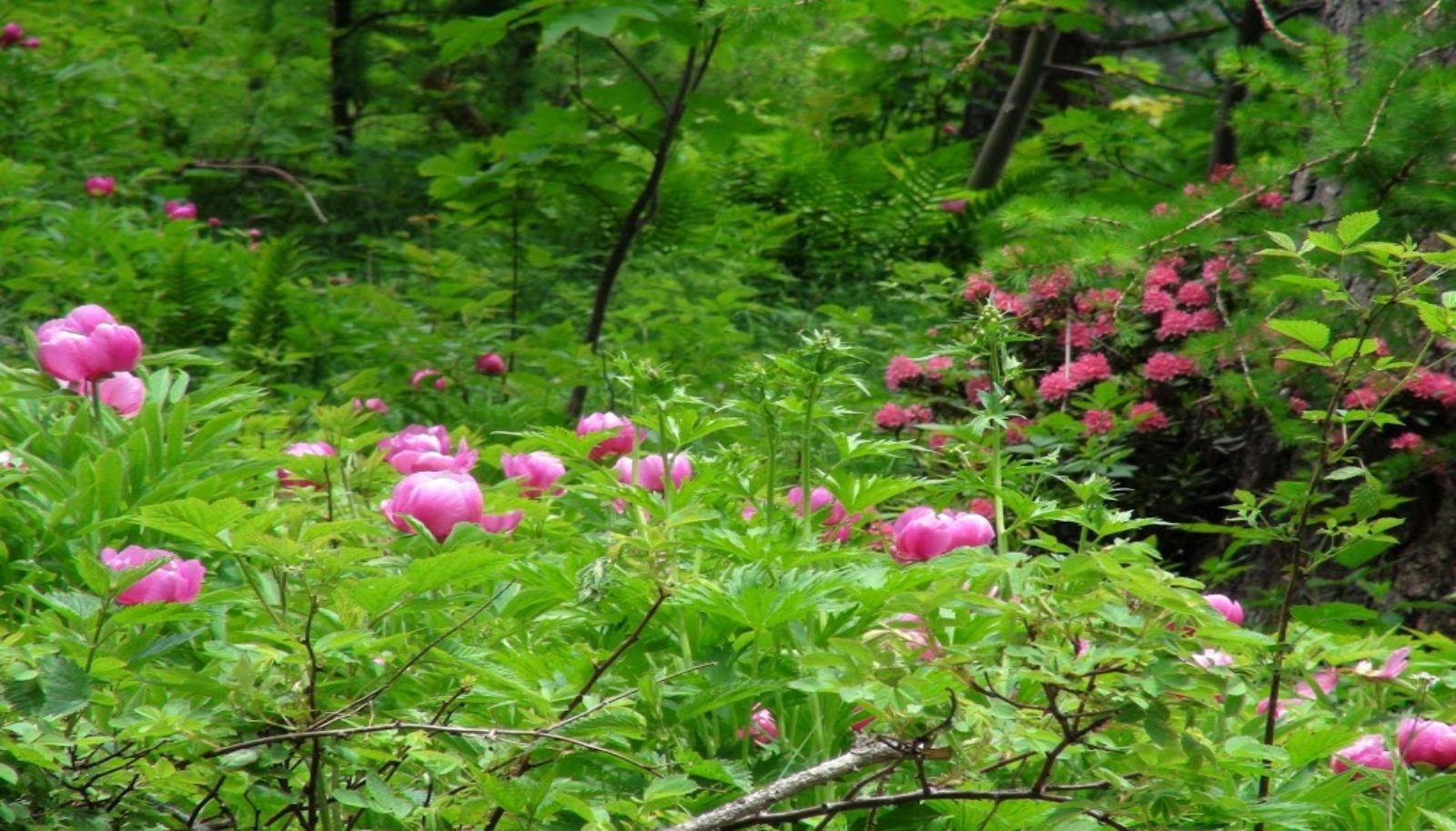 Continuando a seguire i bolli rossi, ignorando le indicazioni per il "Sentiero Natura", ci si inoltra in un sottobosco di faggi e larici, dove si può iniziare ad ammirare le prime fioriture di peonie.
