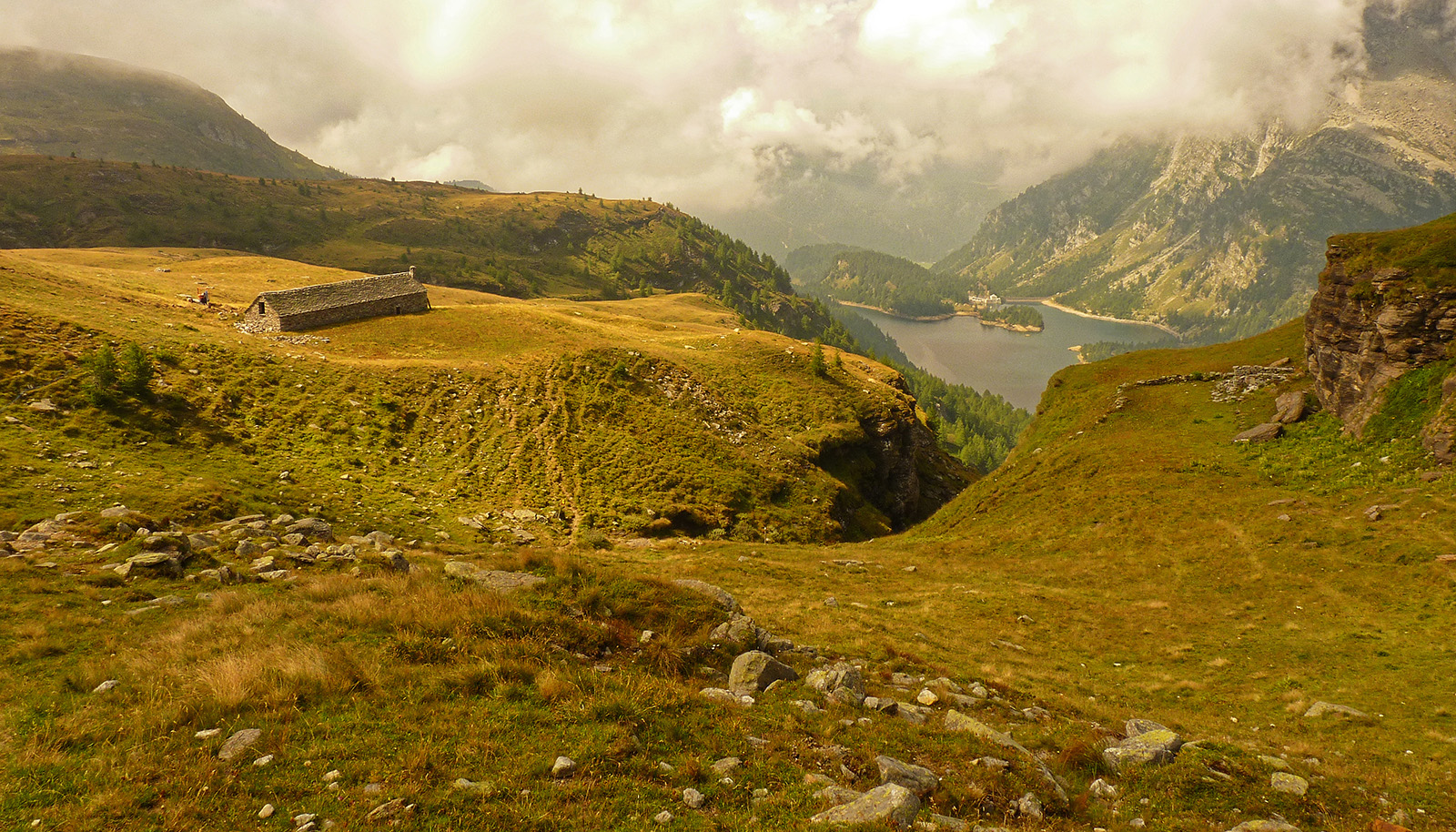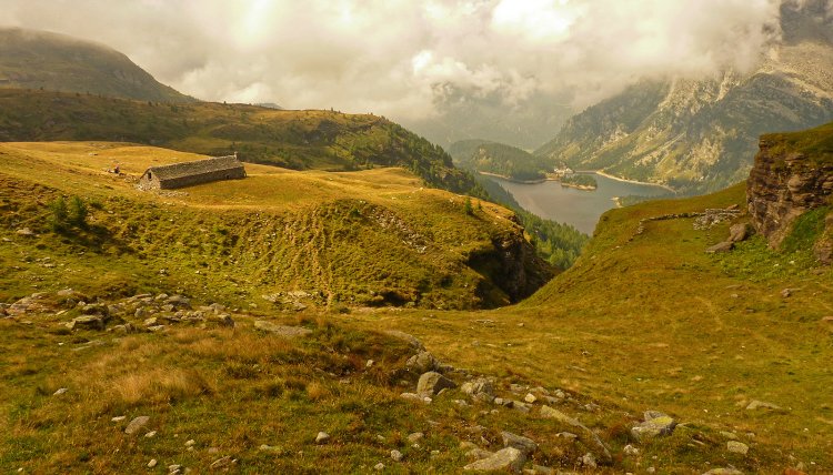e si guada il ruscello, salendo ancora con poche svolte fino a uscire in un vasto altopiano di pascoli, da cui guardando all'indietro si vede il lungo edificio dell'Alpe La Satta con lo sfondo del lago di Dèvero