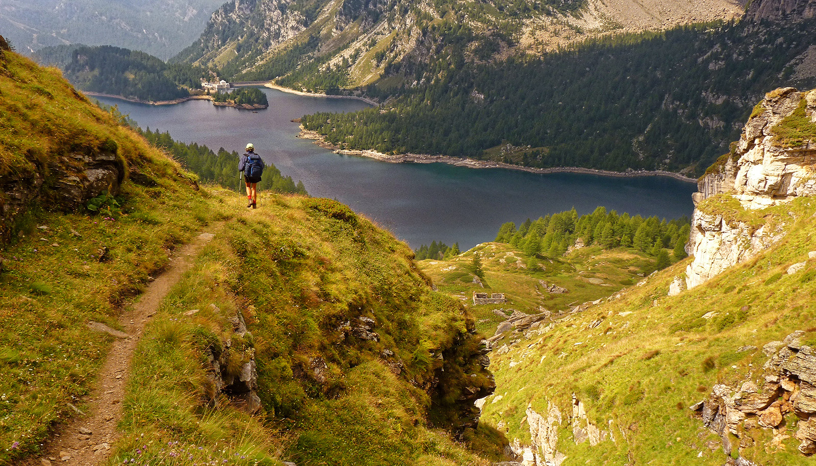 Attraversato il ponte sul torrente Dèvero si passa tra le case della borgata (caseificio, agriturismo, ristorante con camere, chiesetta) e si prende a destra il tracciato di Gta e Sentiero Italia. La stradina, con tratti selciati, sale lungo un valloncello, lasciando a sinistra il rilievo del Montorfano e un sentiero per la diga, e giunge in vista del Lago di Dèvero (1856 m). Si cammina per un tratto un po' più in alto della sponda orientale del lago giungendo a un bivio (1900 m circa, 0.30 ore).