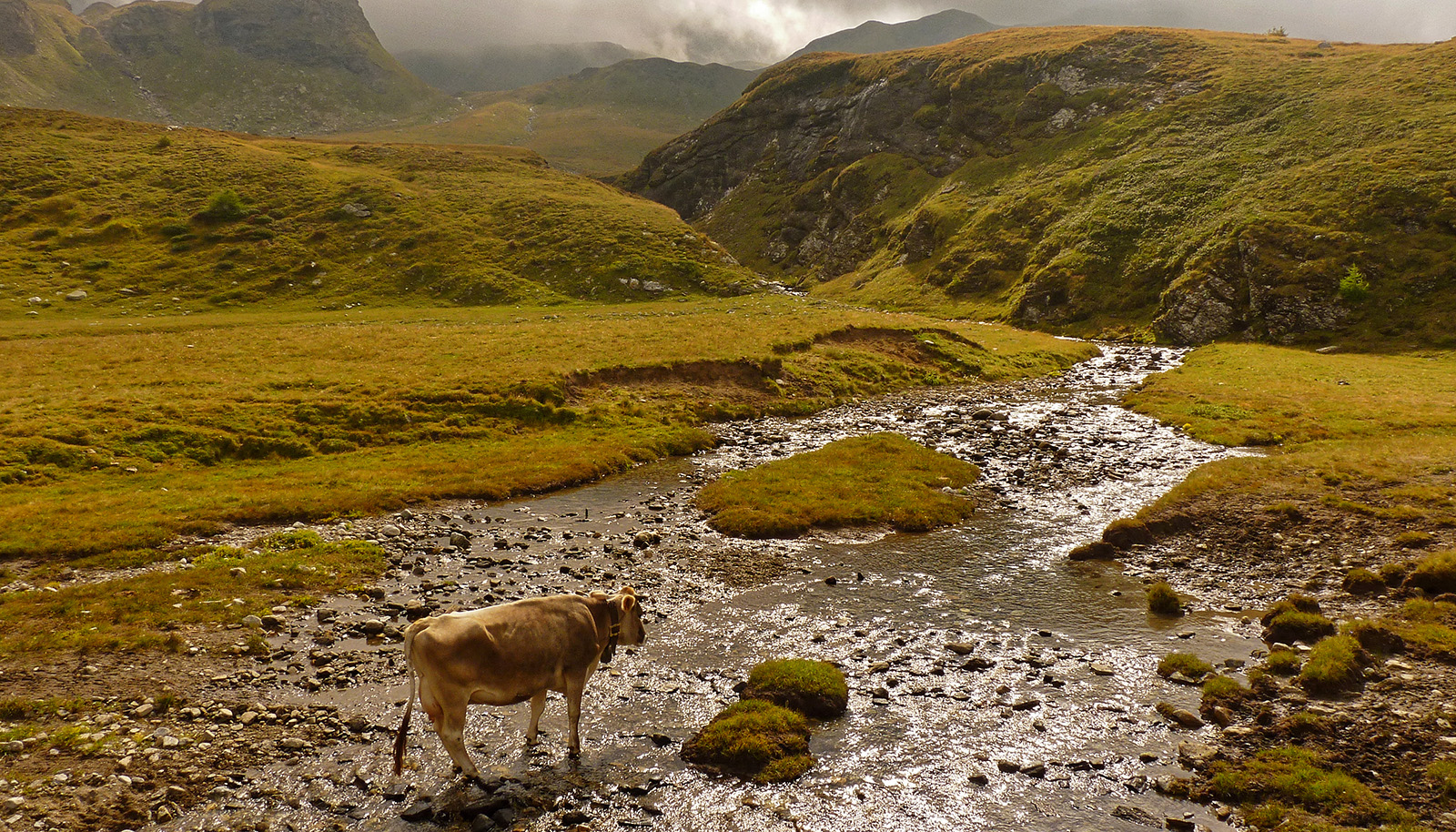 e su un ripiano con ruderi di baite, giungendo in vista di un rio con un bivio (2050 m, 0.30 ore).