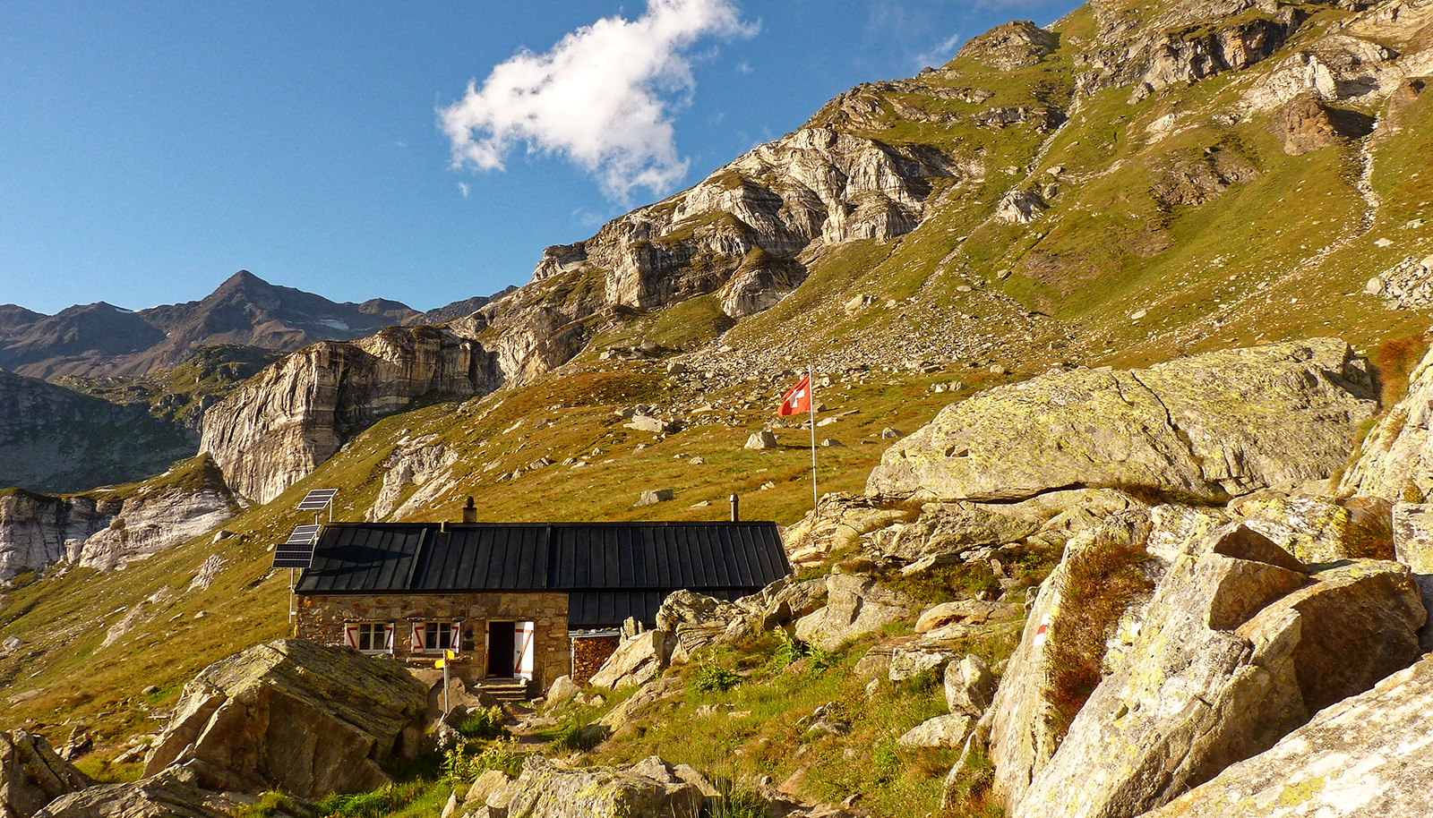, il panorama si apre sulla testata della valle di Binn. Volendo si può proseguire in discesa per raggiungere la non lontana Binntalhütte (2267 m, 0.40 ore a/r)