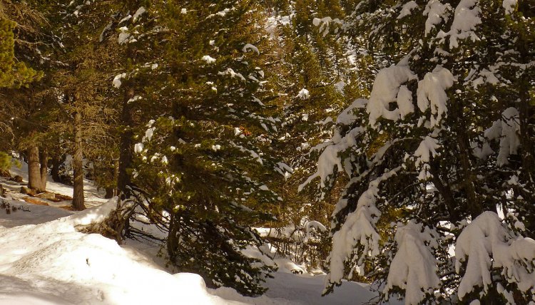 Il sentiero battuto risale un valloncello tra i pini cembri