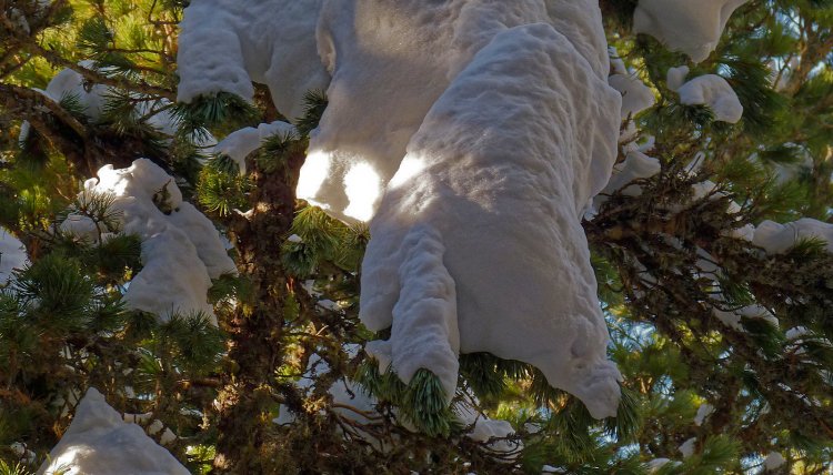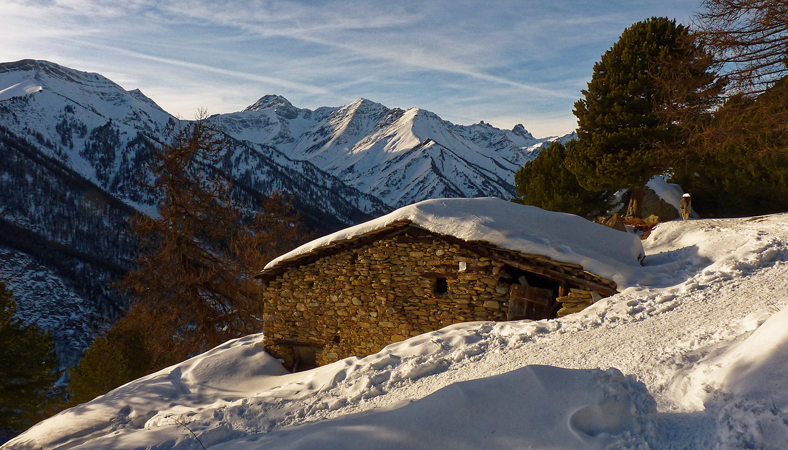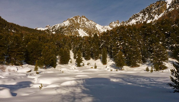, con a destra lo scosceso pendio della Roccio Russo e a sinistra dossi coperti dalla neve, in uno degli angoli più suggestivi del Bosco dell'Alevé. Presto si esce nella radura in cui sorge il rifugio Bagnour