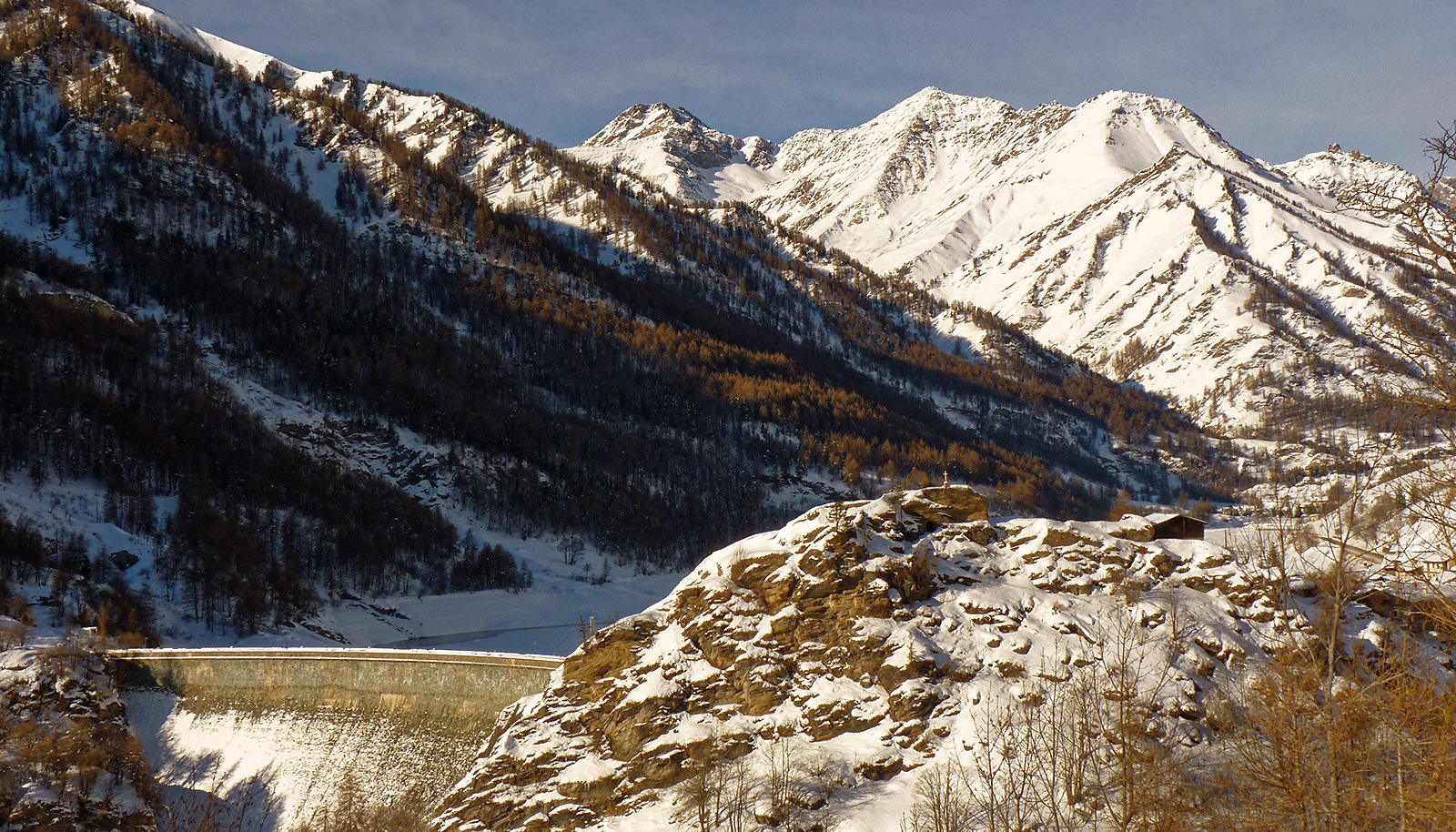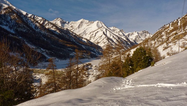 Qui si abbandona il sentiero che scende alle vicine Grange Pralambert soprane e ad Alboin, per svoltare a sinistra (nord), raggiungendo subito il ripiano che ospita il Lago Secco (1897 m): il suggestivo laghetto in realtà è abbastanza ricco di acqua e d'inverno è quasi sempre gelato e coperto di neve