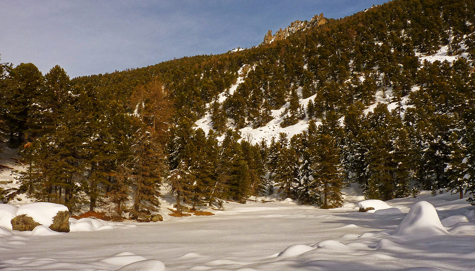 A ciò si aggiunge una discreta difficoltà di orientamento nella fitta cembreta: quindi per muoversi in neve fresca, su sentieri non battuti, è indispensabile disporre di una mappa dettagliata e di una bussola, da affiancare al navigatore (la mappa openstreet/outdoor è abbastanza precisa).
