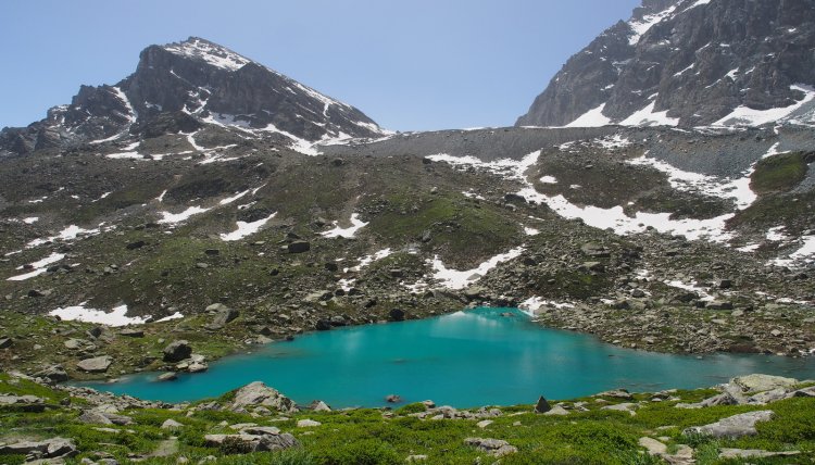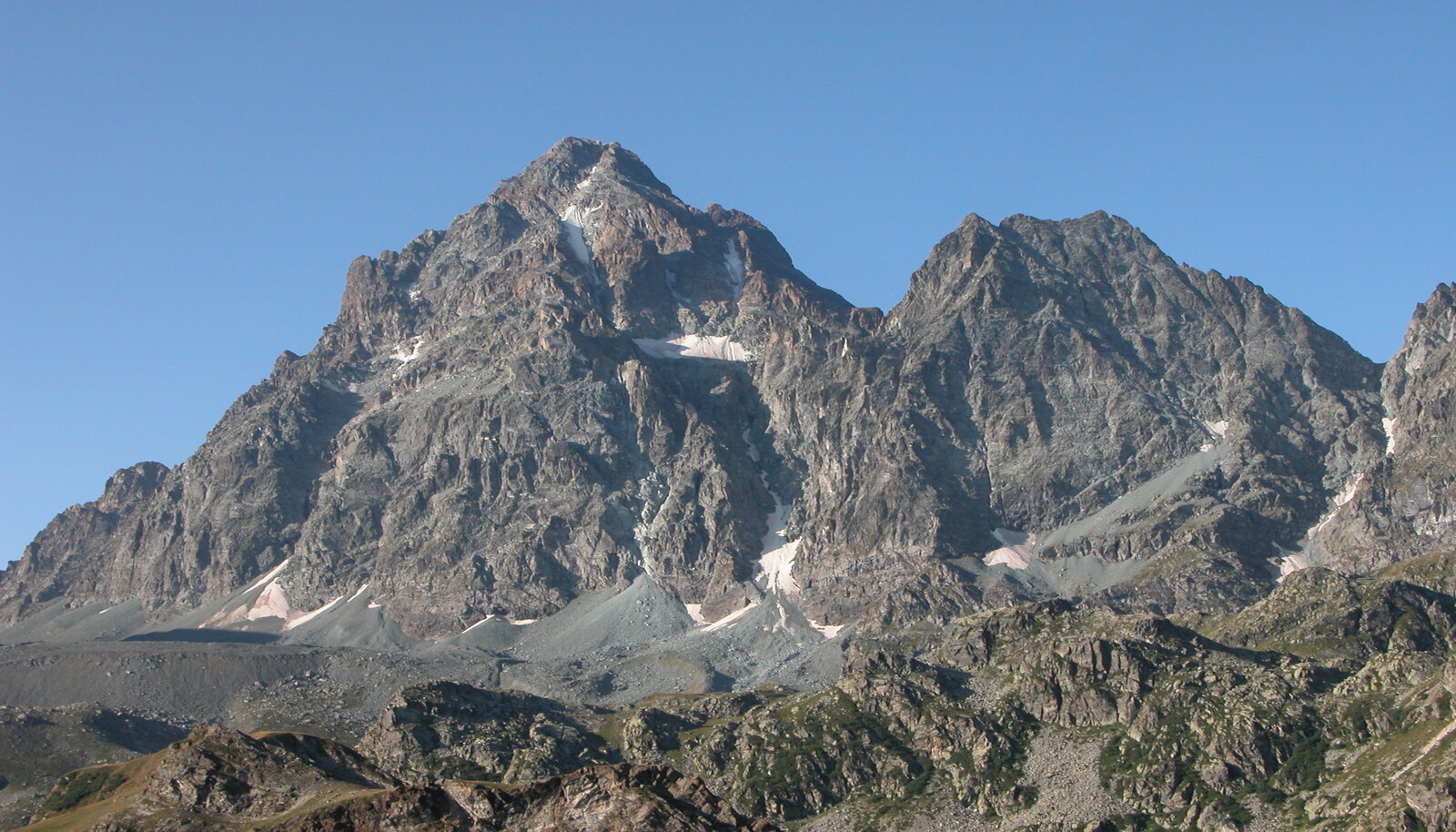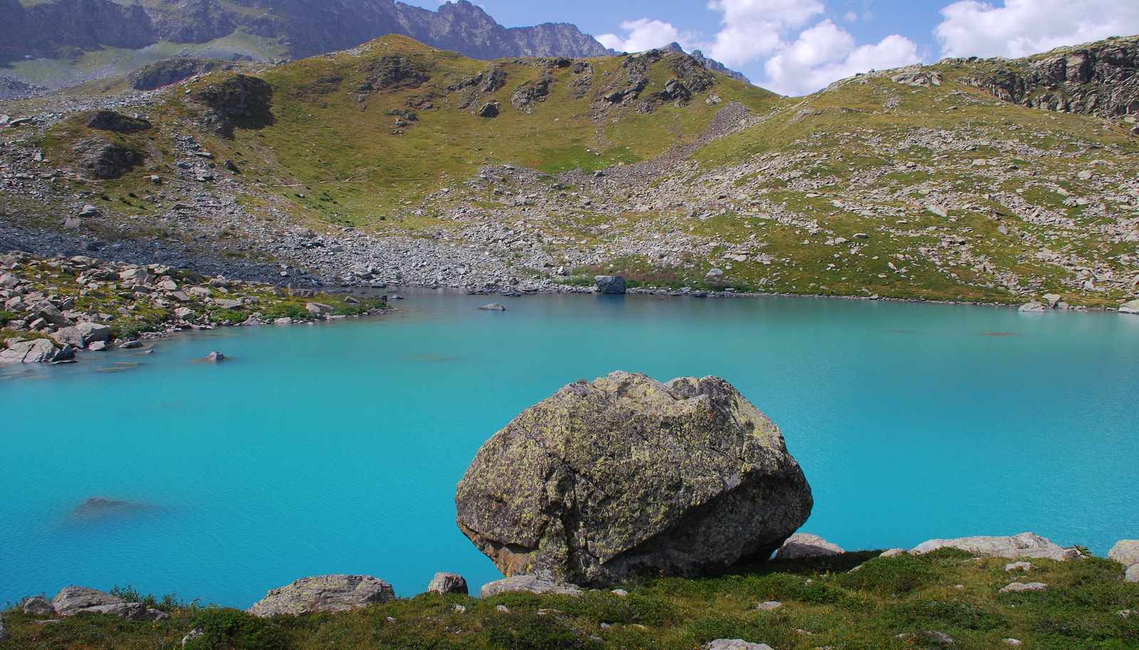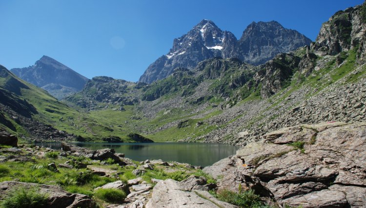 dopo una breve rampa dalle pendenze moderate. Trascurata a destra, al termine del bacino, la diramazione per il Rifugio Giacoletti, continuare in salita tra massi ed erba fino ad un colletto, quindi procedere lungo il costone roccioso sotto lo sguardo vigile del Viso Mozzo. Giunti ad un crocevia di sentieri, incamminarsi sulla traccia di sinistra e giungere così in breve, per mezzo di un ripido sentiero, sulle sponde del caratteristico Lago Chiaretto