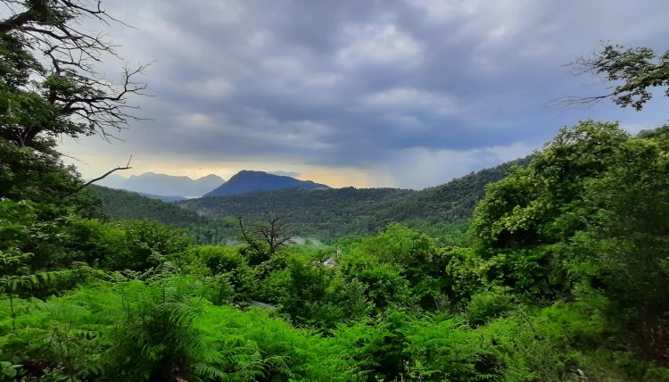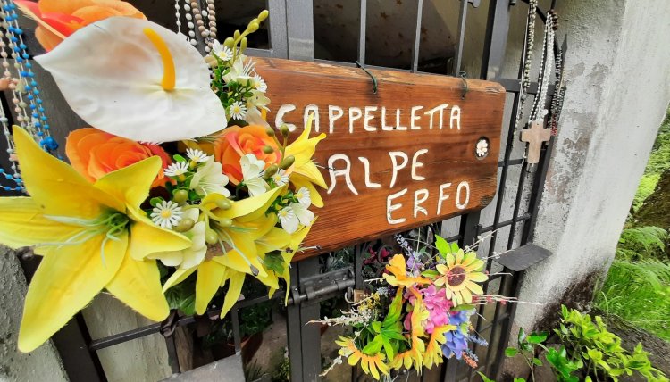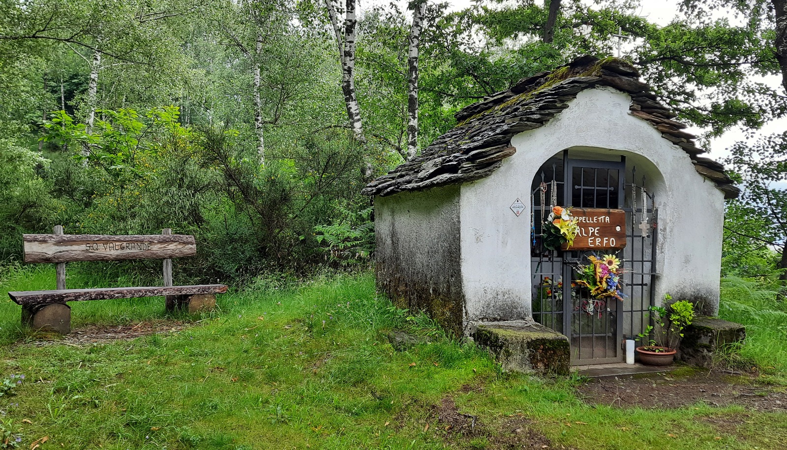 . Continuare sulla mulattiera lastricata che si muove sinuosa tra boschi misti di castagno tagliando il crinale in direzione nordovest e superare alcuni tratti più esposti in prossimità dei ruscellamenti impervi (prudenza in caso di pioggia). Dopo una rampa nuovamente più ripida, lambire alcuni ruderi e immettersi così nella distesa verdeggiante dell'Alpe Monte, ancora ferita dall'incendio scoppiato in loco nell'aprile del 2022. L'itinerario, a questo punto, si fa più dolce, si attraversa una seconda radura impreziosita da baite rimesse a nuovo, si prosegue sulla carrozzabile ora larga e inerbita e si giunge infine alla Cappelletta dell'Alpe Erfo