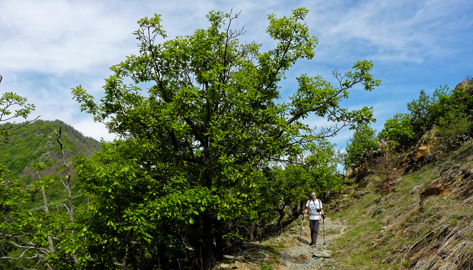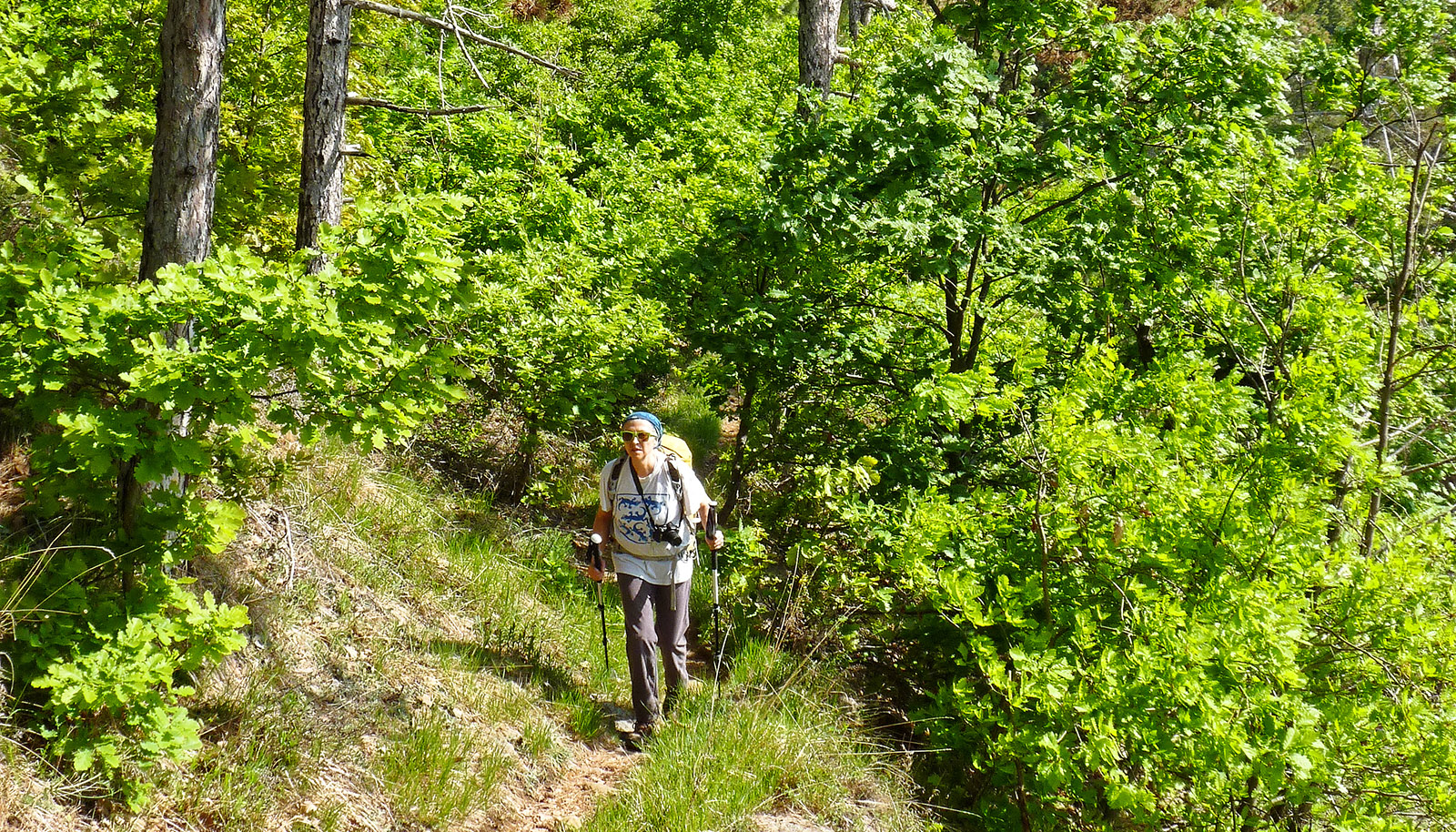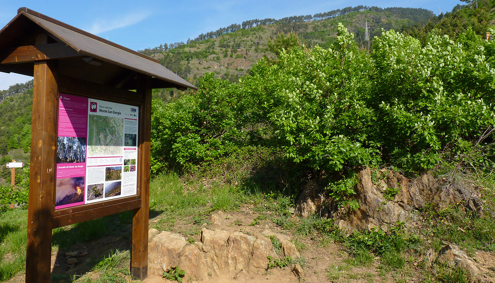 Con pochi passi si aggira il costone e si trova un altro bivio (cartelli): si trascura il sentiero 306 a destra (che si percorrerà al ritorno) e si prosegue sul 307, che sale dolcemente in mezza costa tra i pini nati dopo l'incendio del 1999, con scorci sulla pianura. Il sentiero fa una rampa di pochi metri lungo un rio di solito asciutto, piega a destra aggirando un traliccio dell'alta tensione e con una curva a sinistra riprende la direzione precedente, attraversa il rio e sale nel fitto bosco