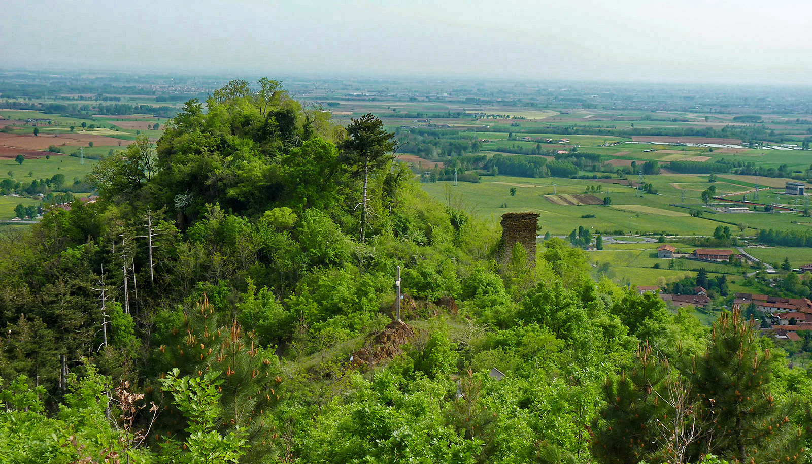 Tornati ai cartelli, si segue il sentiero 306 che scende verso sud con un aereo scorcio su pianura e Piossasco, poi entra nel bosco: qui al cartello per il Colle della Serva si sta sulla sinistra (nessun segno) per continuare sul 306 che scende ripido lungo il costone, in direzione sud. Poi il sentiero piega a destra allontanandosi dal costone e giunge alla confluenza (620 m, 25 min) con il sentiero che proviene dal colle della Serva. Si continua con una discesa piuttosto ripida, tra giovani pini nati dopo l'incendio, poi su un panoramico costone tra pini più radi, da cui si vedono in basso i ruderi di uno dei castelli di Piossasco, il Gran Merlone, con lo sfondo della pianura