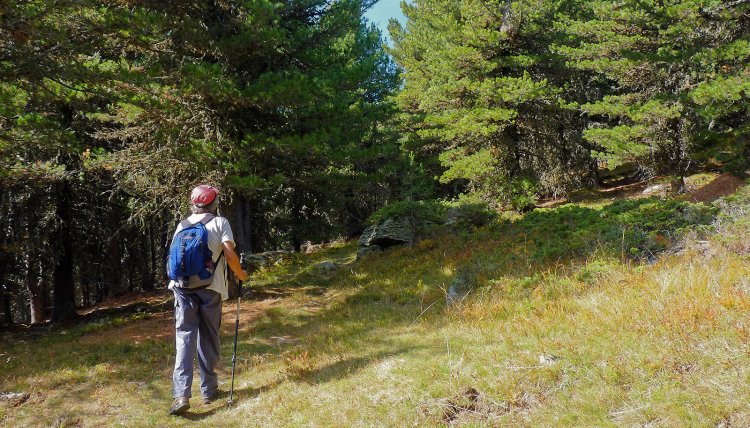 e si continua in lieve salita trovando un bivio su un costone: non si segue la traccia in salita ma si fa un passo in discesa (segnavia), poi il sentiero riprende a salire ed esce su un ripiano fra i cembri (10 min).