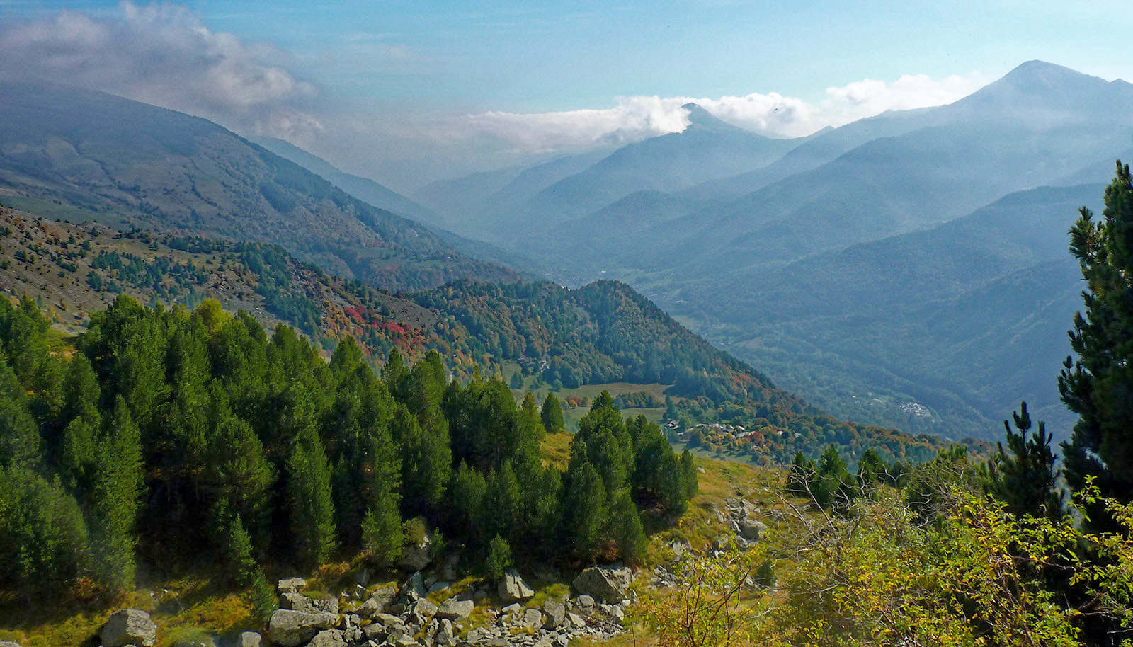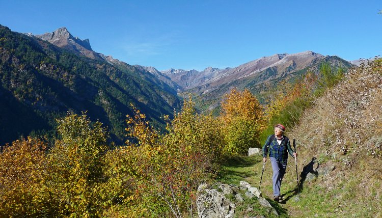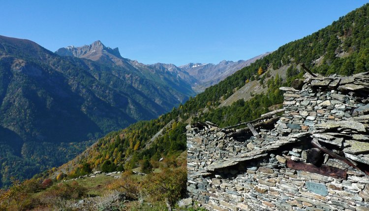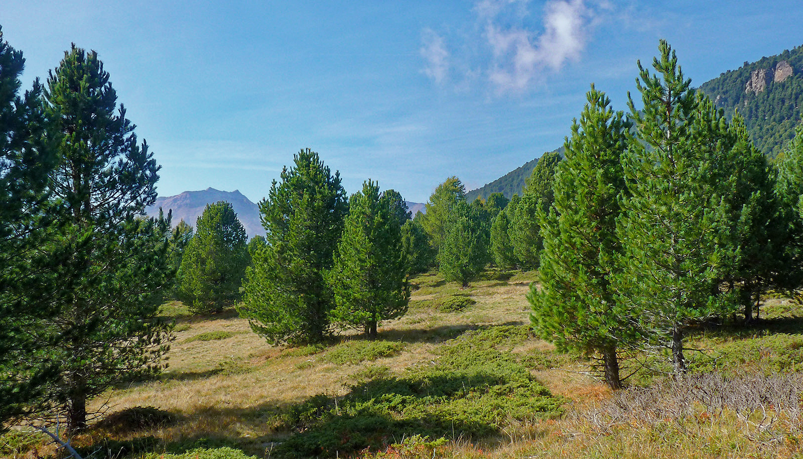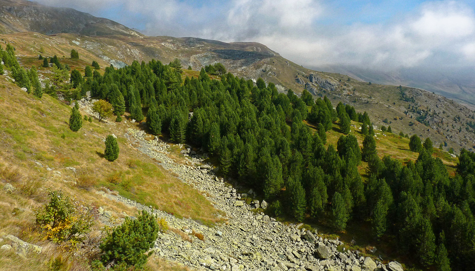 Inizia ora un lungo tratto in mezza costa verso ovest e poi nord-ovest, che si snoda interamente nel bosco di cembri (foto di apertura), con tratti in piano o lievi salite e discese. Nel bosco quasi sempre molto fitto si incontrano rare, piccole radure da cui si intravede appena la valle: risulta quindi difficile capire quanta strada si deve ancora percorrere, mentre è totale l'immersione nell'ambiente ombroso e silenzioso della cembreta. Poi il bosco si dirada, il pendio erboso si addolcisce, riappare sullo sfondo il Pelvo d'Elva ed è facile riconoscere il Pian del Chiot