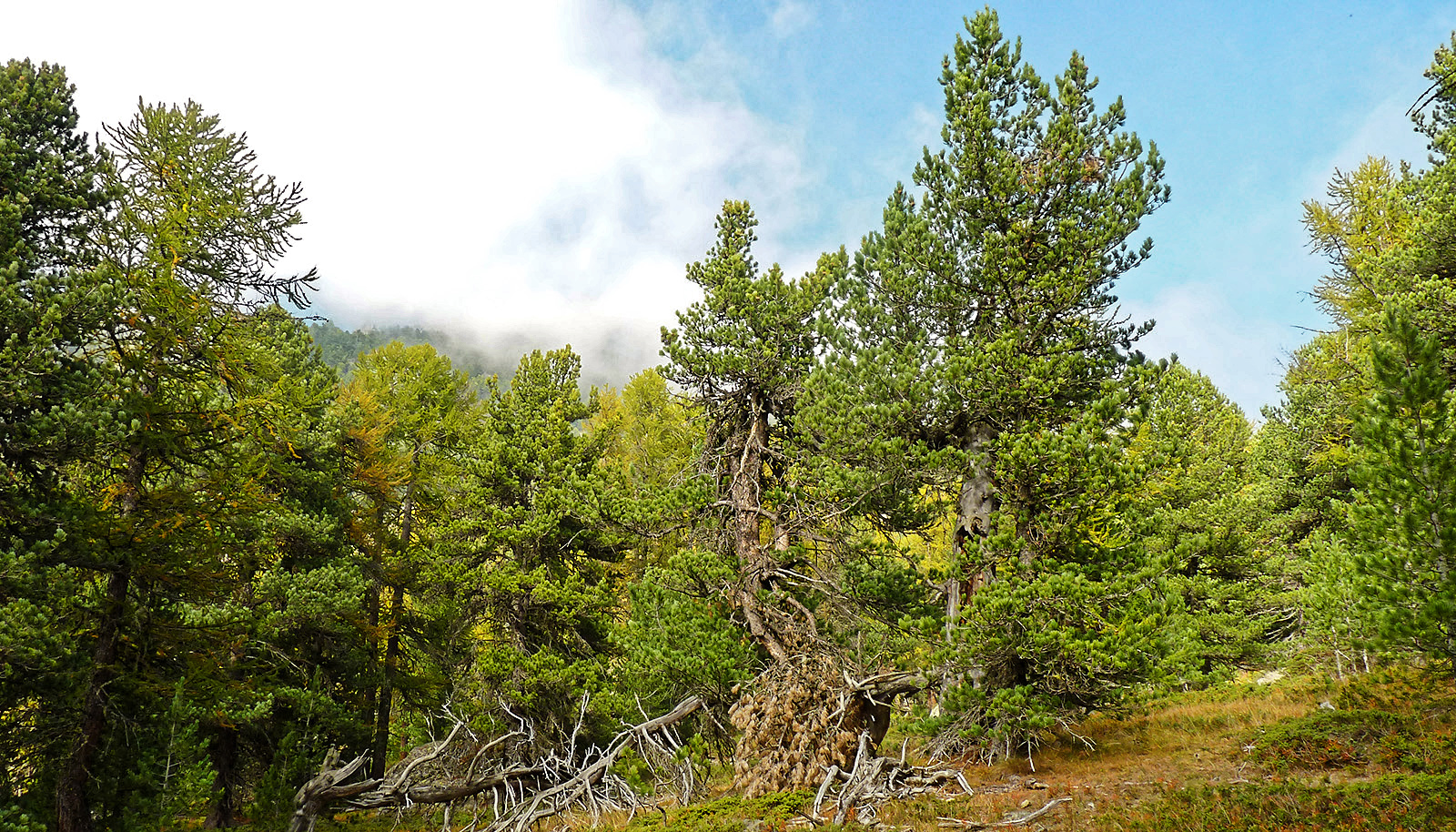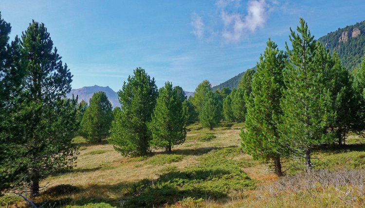 Ora il sentiero U49 prosegue in lieve discesa verso ovest, tra radi, grandi cembri dai tronchi contorti