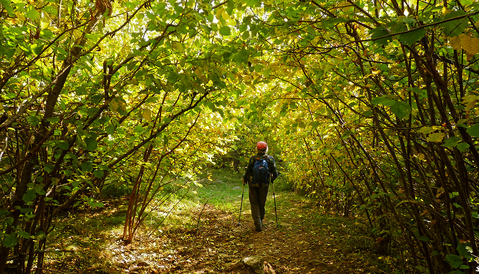 formato dai rami dei noccioli, fa un tratto ripido, poi si tiene su un costone, tocca un cartello (utile solo per chi sale) e poco dopo piega a sinistra giungendo a un bivio con cartelli (1490 m, 20 min).
