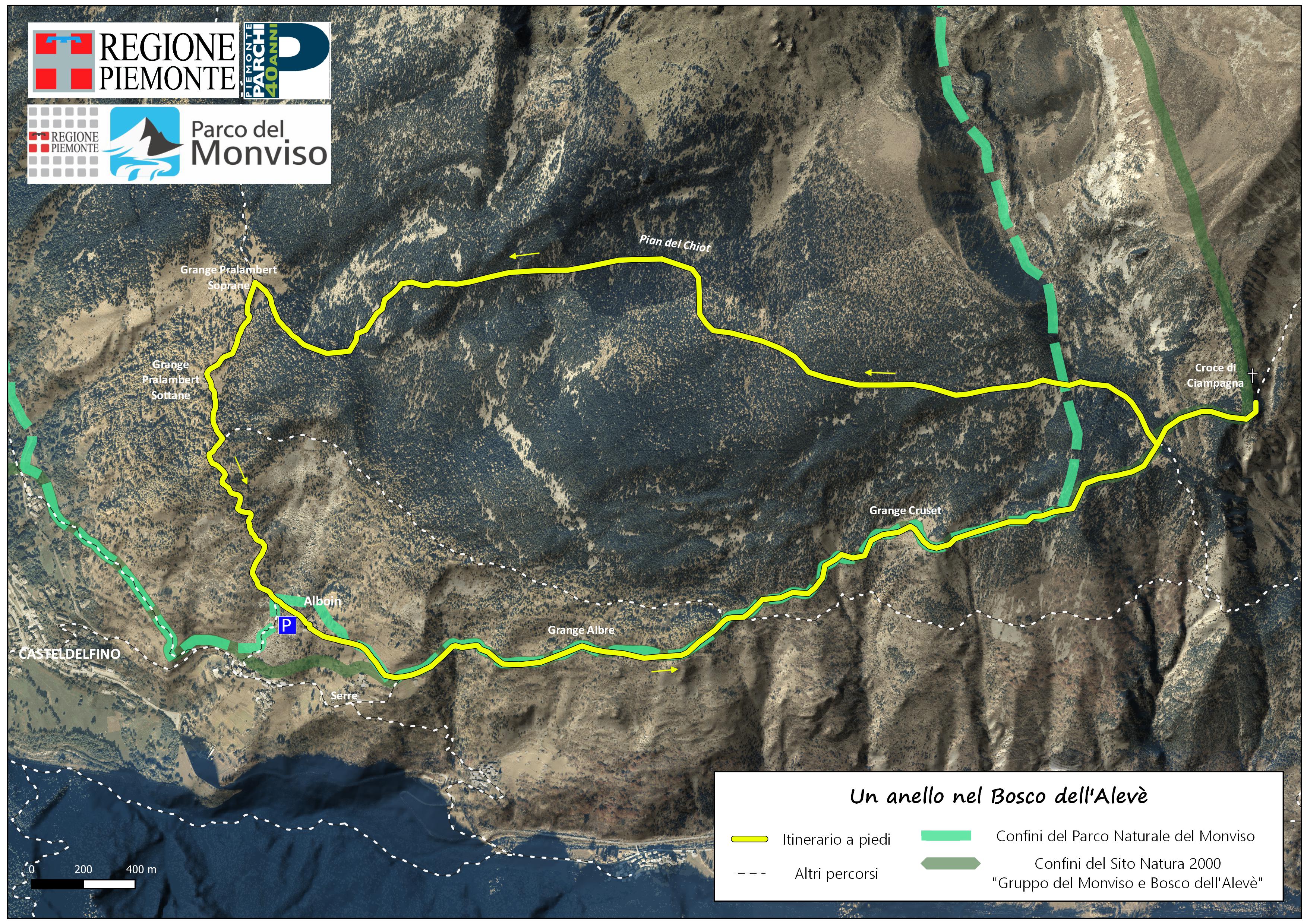 Qui invece proponiamo un itinerario ad anello piuttosto lungo nella parte orientale del bosco. Inizia dalla frazione Alboin e sale in diagonale verso nord-est, sul sentiero che segue il confine meridionale del Parco del Monviso, giungendo presso la Croce di Ciampagna, da cui si apre il panorama sui pascoli di Ciampanesio e sulla media Valle Varaita. Poi si segue il sentiero pianeggiante che va verso ovest nel fitto bosco cembri fino alle belle radure del Pian del Chiot, da cui si scende alle Grange Pralambert e si torna ad Alboin.