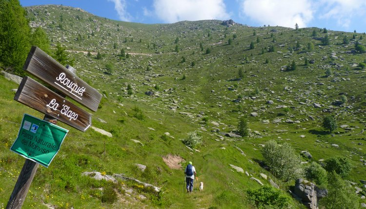 Qui si deve seguire la direzione per Ostana indicata da uno dei cartelli, puntando verso sud-ovest su una traccia fra l'erba che va in piano a mezza costa, sul lato sinistro dell'ampia conca erbosa. Presto diventa un buon sentiero che va in lieve discesa e si porta su un largo costone erboso