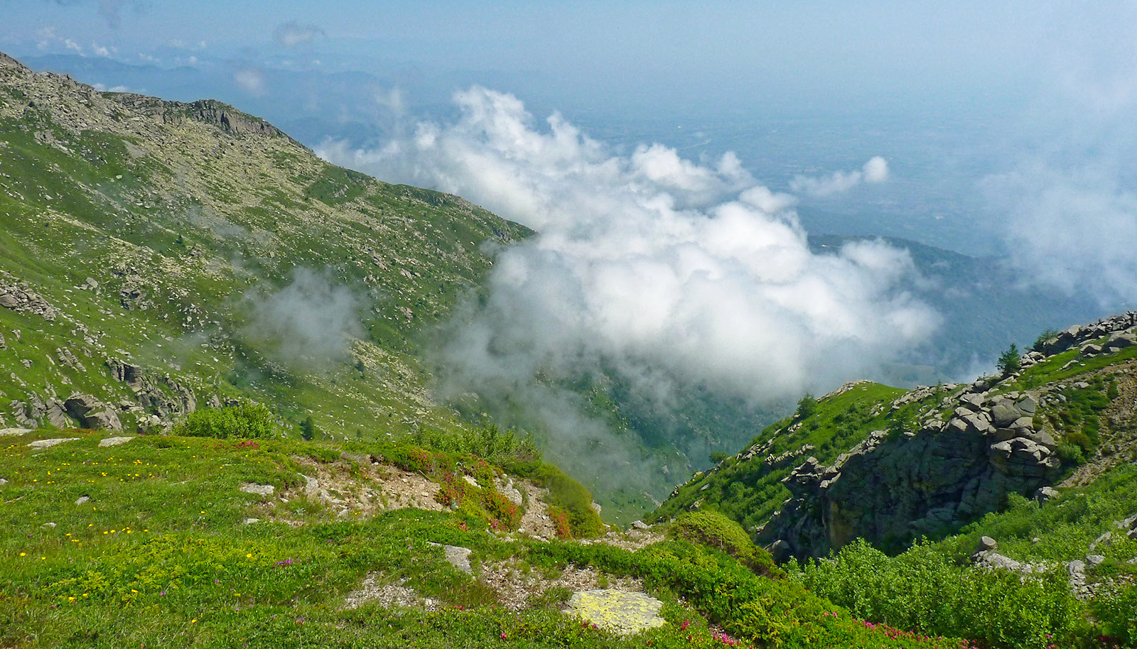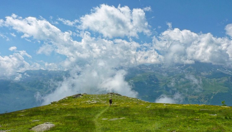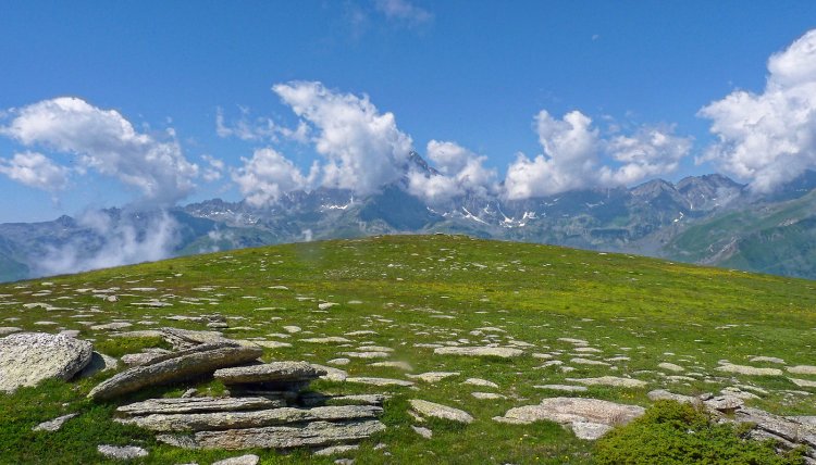 che si abbassa verso sud-sud-ovest con lo sfondo del Monviso (o delle nuvole pomeridiane che lo nascondono), giungendo a un bivio (2192 m, 15 min, cartello in legno utile solo per chi sale).