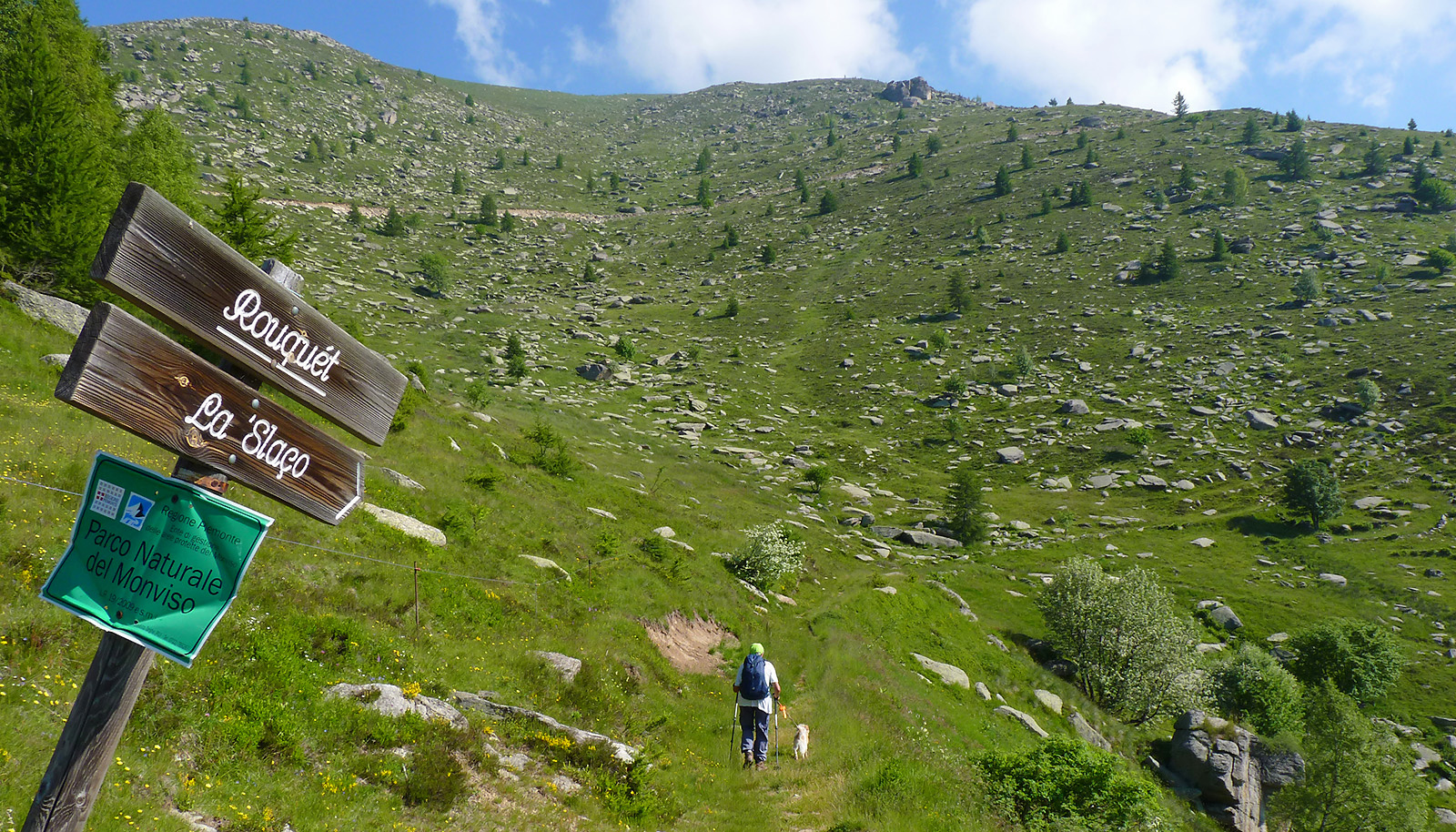 e la direzione in cui proseguire verso La 'Slaço, ossia Selassa in occitano: si segue la mulattiera che all'esterno del tornante va a mezza costa - in piano e lieve discesa - nella conca erbosa. Presso la sorgente di Coumbo Frino il sentiero si perde un poco, ma dopo pochi passi in piano, a valle della zona umida, si ritrova la traccia che sale in diagonale fino a un costone, dove guadagna quota con poche svolte fino a l'Arp (1841 m, 20 min, cartello). Qui il sentiero riprende l'andamento in mezza costa e lieve salita tra erba e sassi, con vista costante sul Monviso