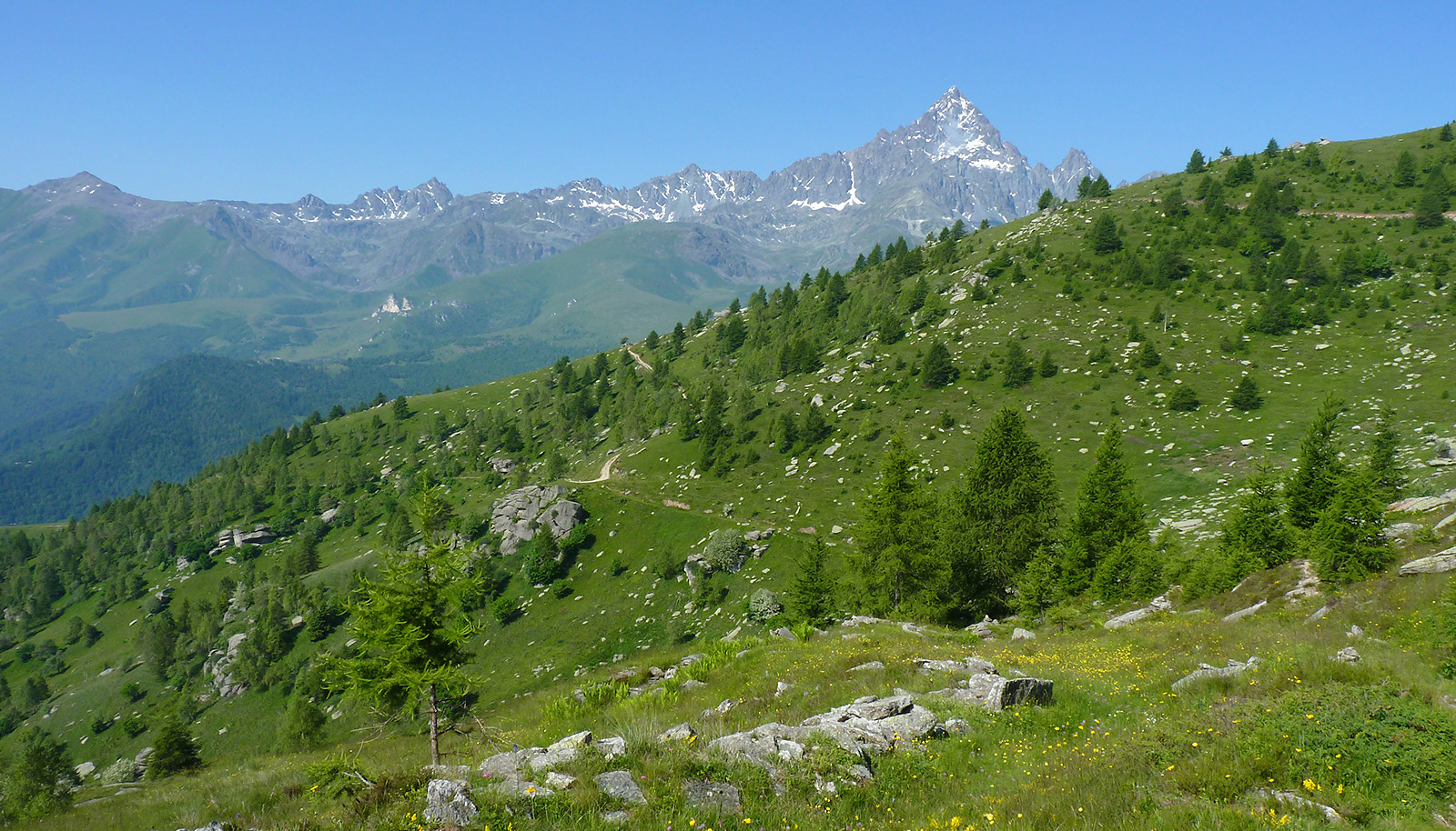 delle mèire Durandini (1622 m) si prosegue sullo stradello sterrato chiuso al transito dei veicoli, che giunge subito al magnifico costone di pascoli detto Pion da Charm (1635 m), dove si apre un bel panorama verso la pianura. Si segue lo sterrato che fa un tornante a sinistra, sale lungo il costone per pochi metri, quindi piega a destra e guadagna dolcemente quota in diagonale tra i pascoli, con un ampio panorama sul Monviso e verso la pianura, fino a un tornante a sinistra (1773 m, 25 min)