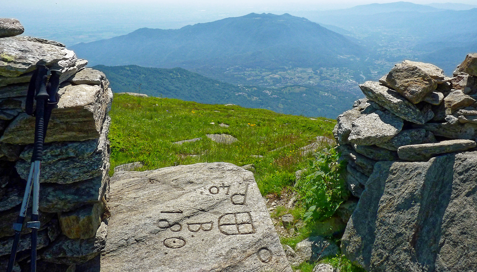 : una croce in uno scudo e le iniziali dei comuni che qui confinano tra loro, Ostana, Barge, Paesana. Il panorama spazia dal Monviso (foto di apertura) alla Valle Po, dal Monte Bracco alla pianura verso Saluzzo e Pinerolo, con in lontananza la collina di Torino, mentre Cervino e Monte Rosa si vedono solo nelle giornate più limpide.