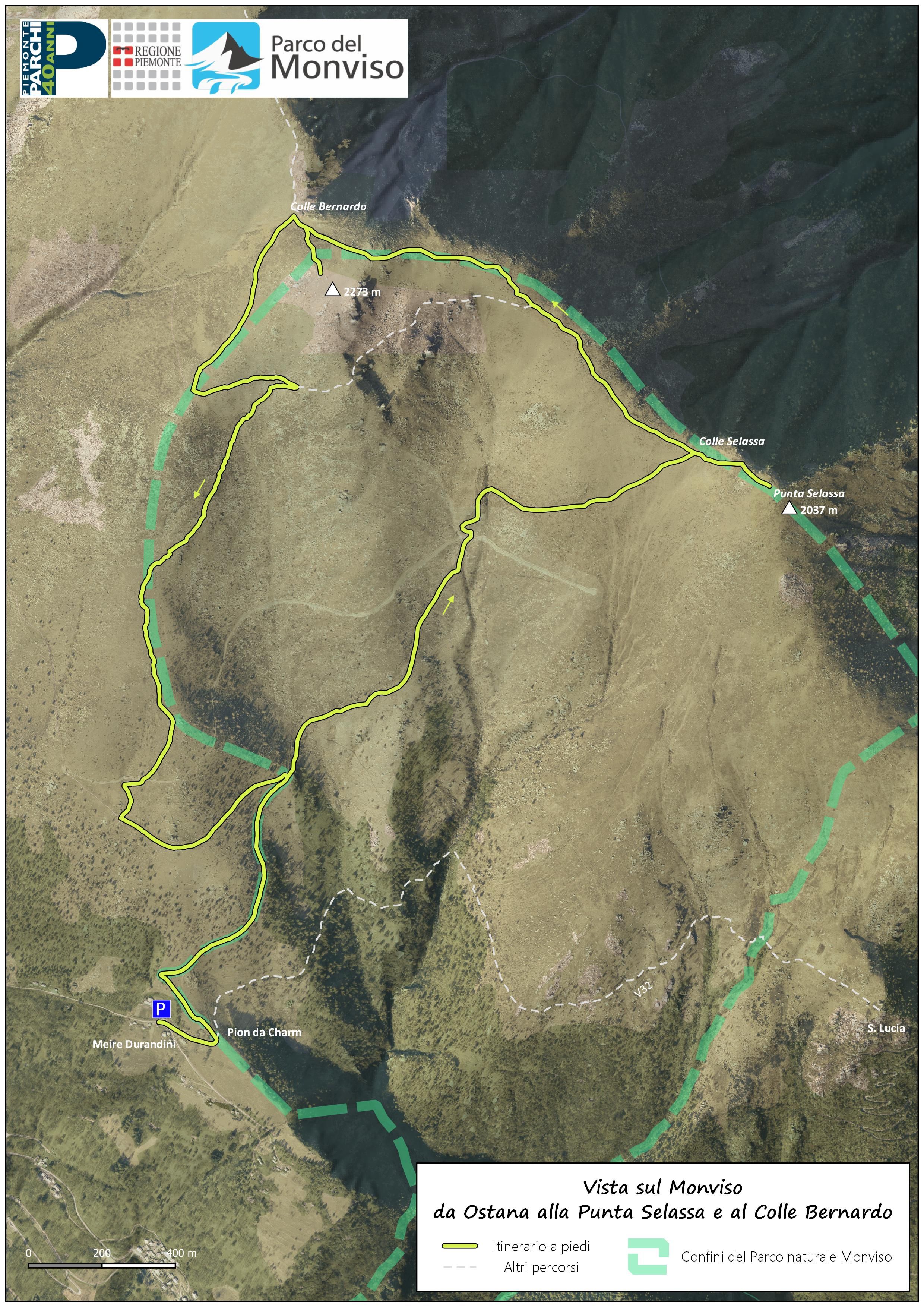 Il territorio di Ostana è noto per gli interventi di restauro e di recupero delle sue abitazioni e delle sue borgate, favorite da una amministrazione comunale attenta all'ambiente naturale, alle architetture alpine e allo sviluppo di attività produttive, agricole e turistiche. Sono anche stati segnalati alcuni itinerari che si snodano fra le molte borgate, mentre altri sentieri risalgono i pendii verso la Punta Ostanetta. Alcuni tracciati purtroppo risultano poco segnalati, e solo qualcuno è stato inserito nel catasto regionale. Ad esempio non è stato accatastato il bel sentiero che - partendo da una strada chiusa al transito - sale al colle e alla Punta Selassa (La 'Slaço): non ci sono segnavia bianco-rossi, ma il tracciato è indicato da ometti in pietra ben visibili e da cartelli in legno, vecchi ma ancora in discrete condizioni. Giunti sulla Punta Selassa (2037 m) si ammira un magnifico panorama sul Monviso, sul Monte Bracco, sulla conca di Agliasco e verso la pianura, con in lontananza il Monte Rosa. Dalla cima si può continuare sul sentiero - indicato da ometti e vecchi segni rossi - che sale lungo il panoramico costone erboso che separa la Valle Po dalla Valle Infernotto e che delimita l'area protetta dal Parco del Monviso. Si arriva così al punto più elevato della gita, un panoramico dosso erboso senza nome (quota 2273 m) da cui si scende al vicino Colle Bernardo.