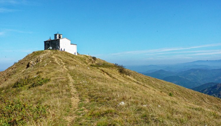 Camminando intorno alla chiesetta il panorama si apre a 360° sulle cime dell'Appennino piemontese e sul tortuoso solco della Valle del Gorzente
