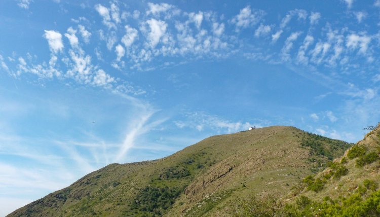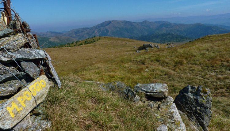, con a destra un vasto panorama sui rilievi liguri. Passati a fianco di un piccolo rudere e di un palo giallo del metanodotto, si lascia a sinistra il grande rudere di una casermetta della Dicat (Difesa contro aerea territoriale). Poi i segni gialli vanno diritti su una gradinata in pietra tra le roccette sommitali, mentre una buona traccia taglia a mezza costa il pendio erboso a valle delle roccette, piega a sinistra ed esce su un ampio costone, con a destra un dosso con un grande ometto di pietre e a sinistra le due croci sulla cima del Monte Poggio (1081 m, 25 min). I due rilievi offrono un ampio panorama