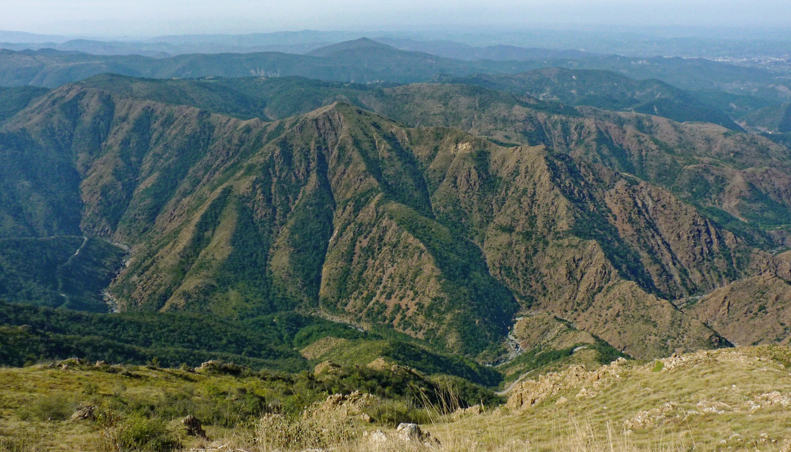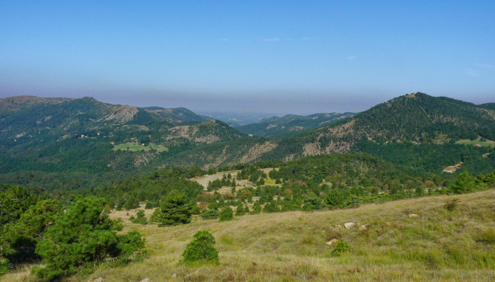 . Il sentiero guadagna quota per la massima pendenza su un terreno non troppo ripido, tra erba, rocce rossastre e giovani esemplari di pino nero. Si sale diritto o con lievi svolte in direzione sud-est, con ampi panorami su rilievi a perdita d'occhio