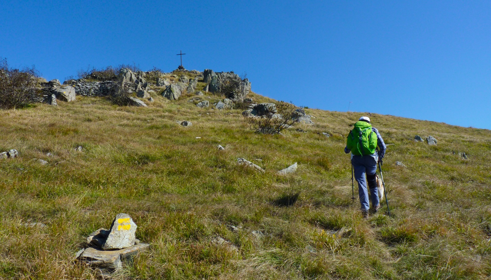 e a sinistra sulla conca di Capanne Superiori (15 min). Poi il sentiero poggia a destra facendo alcuni metri in piano e prosegue in lieve salita diagonale verso pini più grandi (i cambi di direzione sono indicati da frecce gialle). Presso i pini fa pochi metri per la massima pendenza, poi riprende la diagonale verso destra tra pini dai rami contorti per il vento. Qui fa un tornante a sinistra, sale per poco sulla massima pendenza tra pini più radi, poi poggia ancora a destra raggiungendo un costone meno inclinato. Si risale il costone erboso (direzione nord-est) verso la cima già ben visibile