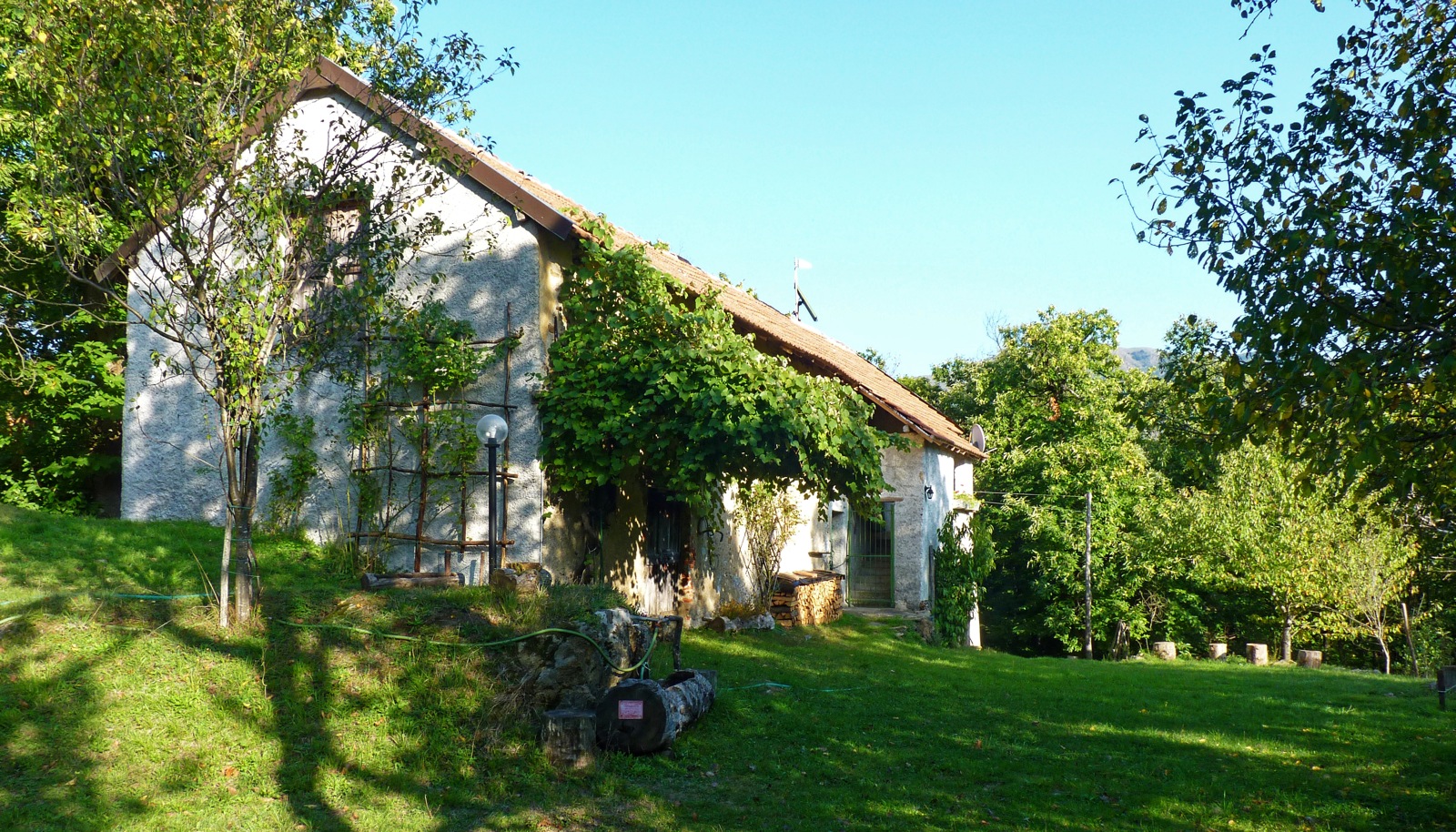 si trova a sinistra la prosecuzione del sentiero 405 che attraversa in piano la radura a monte della cascina, e confluisce su un viottolo che si segue per pochi metri, fino al cartello che indica a sinistra il sentiero 405. Si sale a svolte tra imponenti esemplari di castagno