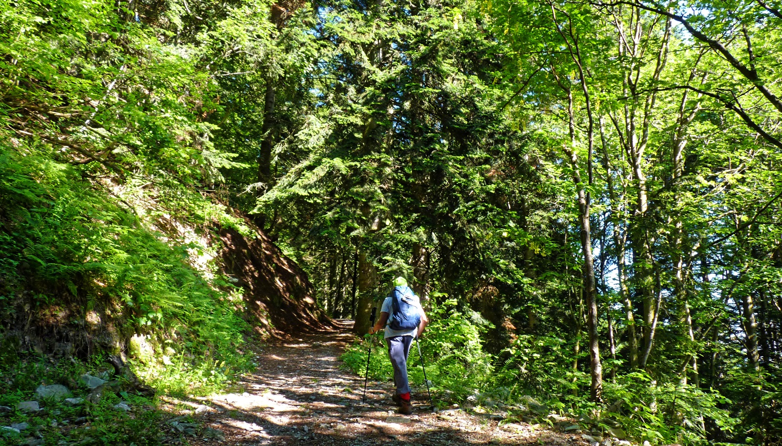 , a cui il sentiero si avvicina (ma il punto di risorgenza cambia a seconda della stagione e delle piogge). Poi si tiene a mezza costa, allontanandosi dal corso d'acqua, entra in un fitto bosco di faggi e torna vicino al torrente, che si attraversa su una passerella (1374 m).