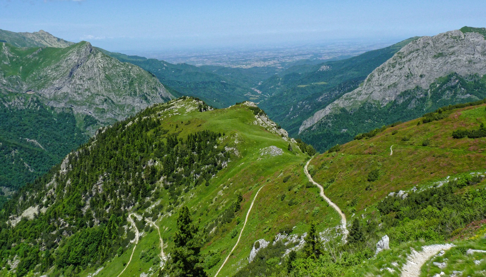 che si allunga verso la pianura. Dalla sella si può seguire il sentiero più ripido che sale lungo il costone, o proseguire sulla strada militare che fa un altro tornante con vista sui tornanti percorsi fin qui