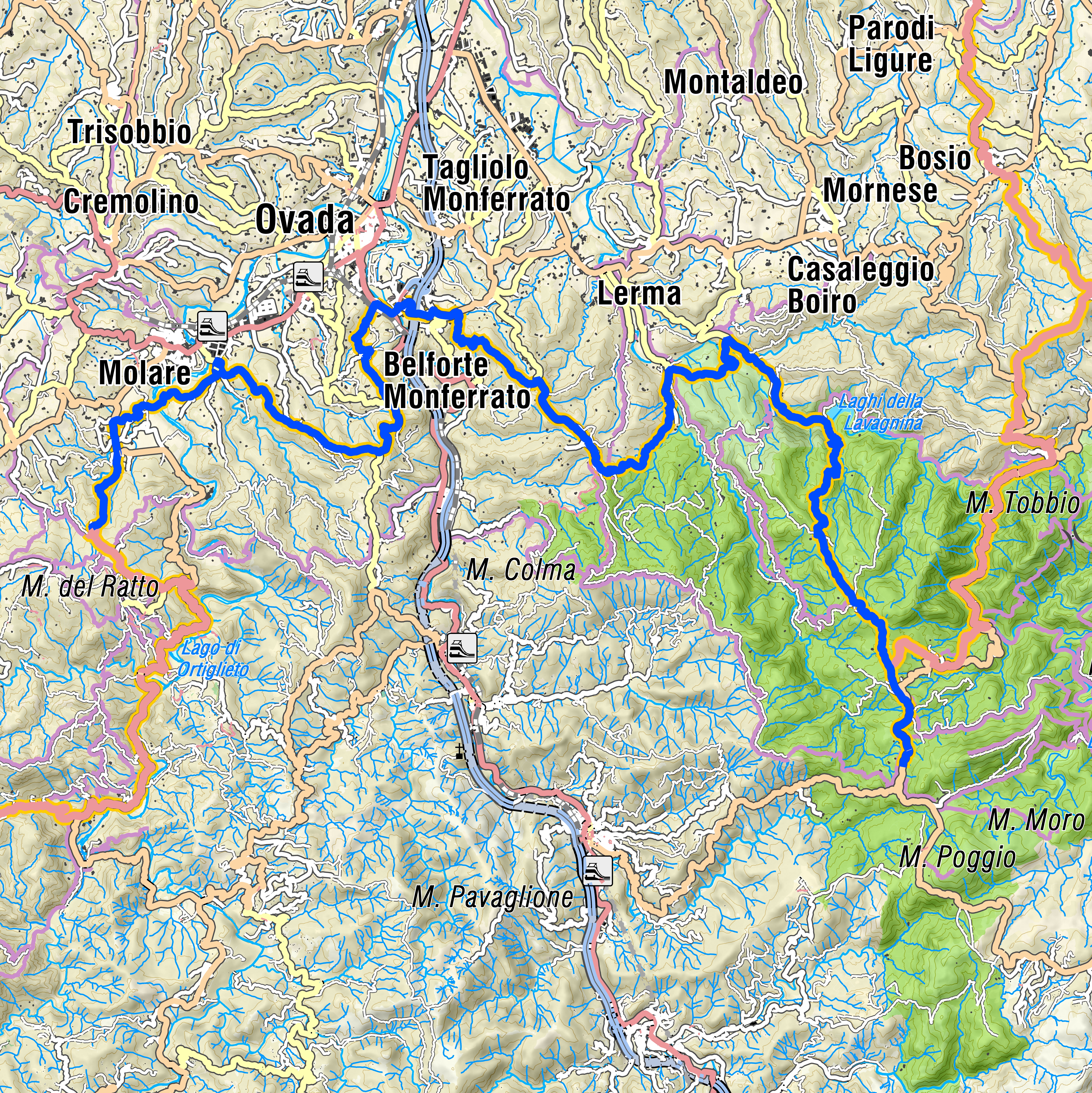 Partendo dal rifugio Nido del Biancone si ripete un breve tratto di asfalto già percorso nella tappa precedente fino a raggiungere località Foi. Da qui si riprende la sterrata direzione Cirimillla, strada carrozzabile molto semplice. Necessario prestare attenzione ai veicoli. Si mantiene sempre la destra e si raggiunge la cascina Cornaggetta per poi proseguire, sempre a destra, fino ad arrivare al pianoro Località Maggie. Si svolta poi a destra dove inizia la pista forestale delle Ferriere, quindi non più carrozzabile, direzione lago inferiore della Lavagnina. Qui il percorso è molto facile e tutto in discesa fino al raggiungimento della diga. Attraversata la diga si procede a sinistra lasciandosi il lago sulla destra. È consigliabile percorrere il sentiero naturalistico del lago della Lavagnina per poi tornare indietro. Si continua poi verso Casaleggio Boiro e, passata una sbarra, si prosegue per un breve tratto di asfalto. Si imbocca a sinistra la sterrata che porta verso il fiume in zona Mulino di Casaleggio dove, dopo aver guadato il fiume, inizia una sterrata molto bella con qualche salita poco impegnativa immersa nel bosco che esce di fronte all'area attrezzata Cirimilla. Si prosegue in direzione Villaggio Primavera per poi iniziare una strada interpoderale sterrata con salite abbastanza impegnative fino ad arrivare ad un bivio e proseguire sulla destra fino a raggiungere località Magnoni, da qui breve tratto di asfalto in discesa lungo la strada della Colma per poi imboccare un sentiero a sinistra sterrato a tratti un po' tecnico che arriva fino all'abitato di Belforte.