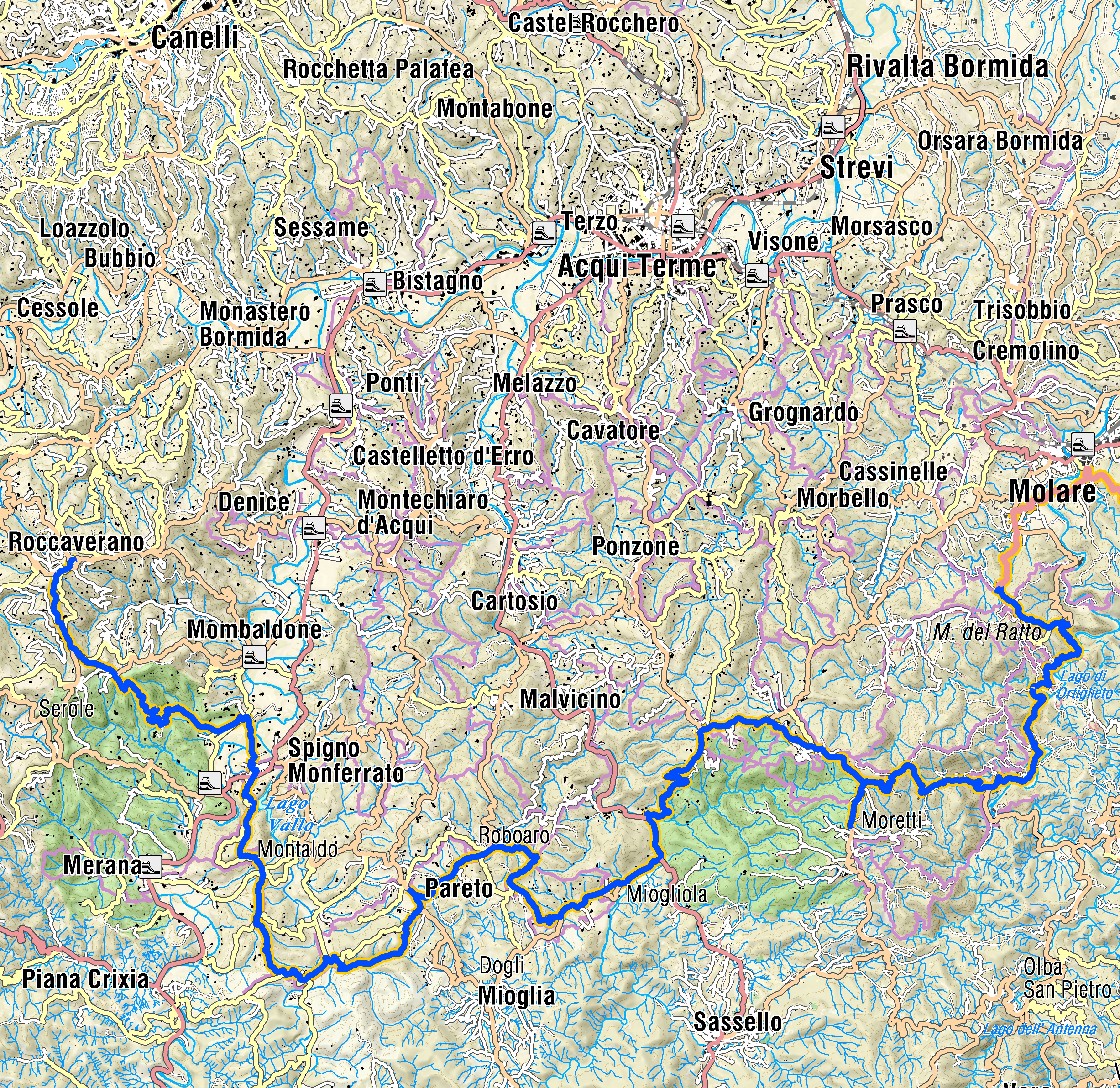 Si prosegue lungo una strada tra i calanchi molto facile e panoramica fino ad arrivare al paese di Reboaro, da qui si procede in asfalto fino ad arrivare al centro abitato di Pareto. Dall'abitato di Pareto si torna leggermente indietro per poi svoltare a destra e scendere in sterrato fino a raggiungere il torrente Valla che si costeggia per un breve tratto e si attraversa anche con un guado. Prestare attenzione alle precipitazioni precedenti. Usciti dal bosco si riprende l'asfalto in direzione Squaneto dove, dopo alcuni tornanti in salita, si prende l'Antica Strada della Langa che da subito si presenta stretta ed immersa nel bosco ma non particolarmente difficile. La strada poi si allarga fino a raggiungere il paese di Montaldo. Lasciato il paese di Montaldo si prende il sentiero che sale dietro la chiesa e si raggiunge la vetta in sterrato. Da qui si procede su un singletrack in cresta un po' esposto. Si inizia poi a scendere attraverso un sentiero stretto e veloce. Prestare attenzione ai tiranti dei pali della luce. Si attraversa più volte l'asfalto e, verso fine discesa, si prosegue verso il centro di Spigno Monferrato. L'ultimo tratto di questa tappa si sovrappone alla tappa 19 da fare a piedi e attraversa i calanchi della Zona Speciale di Conservazione "Langhe di Spigno Monferrato"